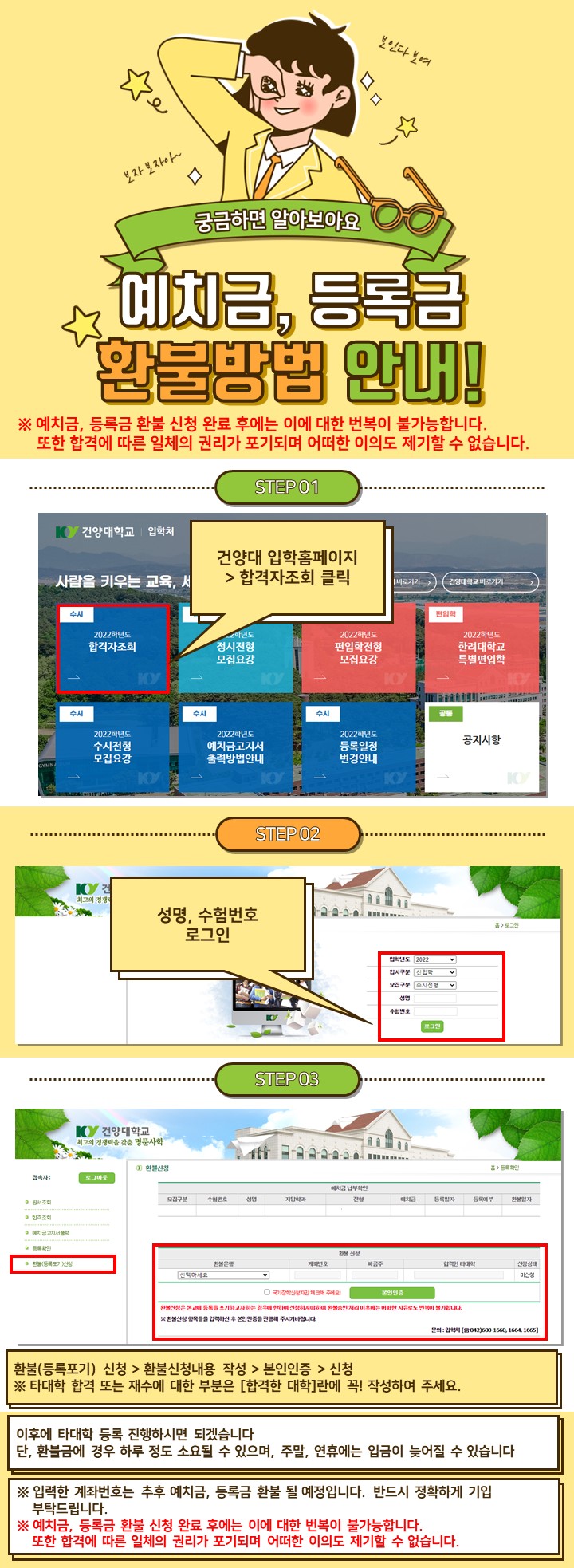 『 예치금, 등록금 환불방법 안내 』글의 상세내용을 확인하는 표로 제목, 부서명, 등록일, 조회, 첨부, 내용으로 나뉘어 설명합니다.