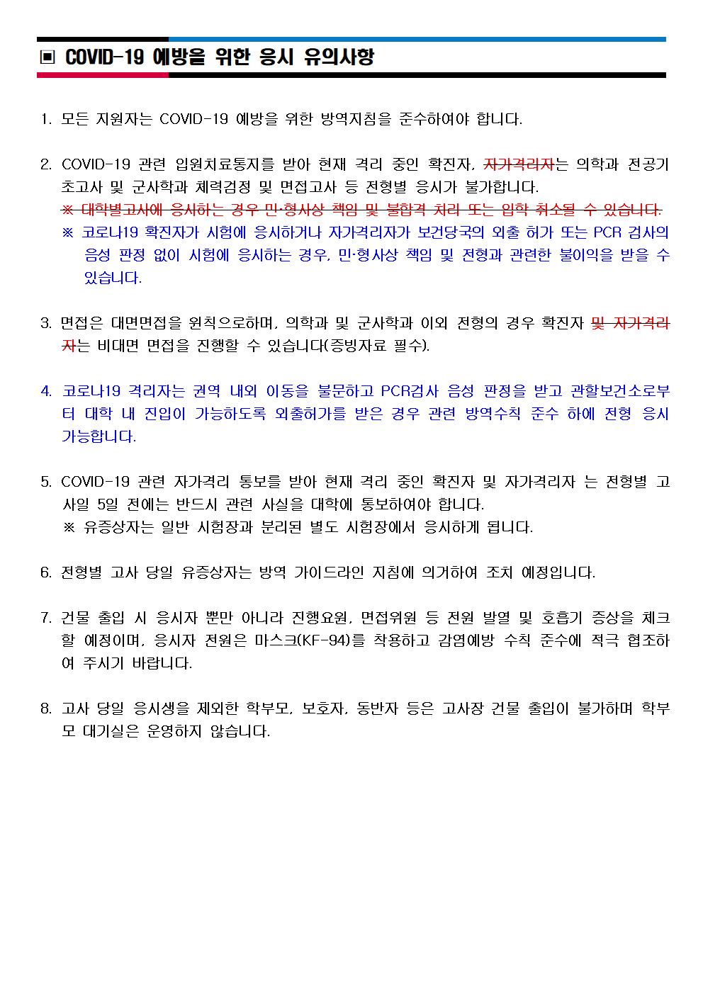 이에 따라 기존 모집요강에 수록되어있는 COIVD-19 예방을 위한 응시 유의사항을 다음과 같이 변경하고자합니다.