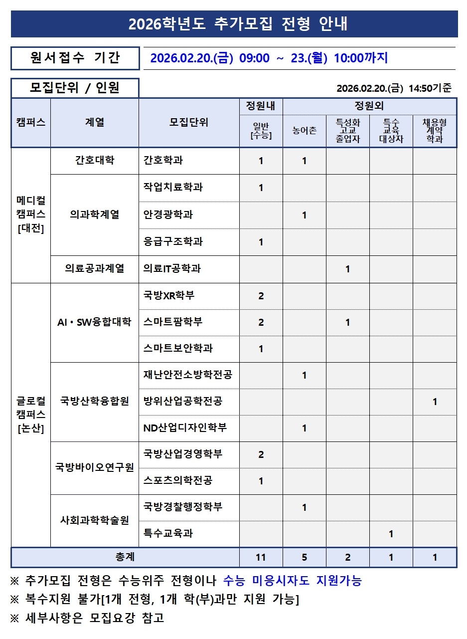 2026학년도 추가모집 모집요강을 재탑재하였으니 확인해 주시기 바랍니다.