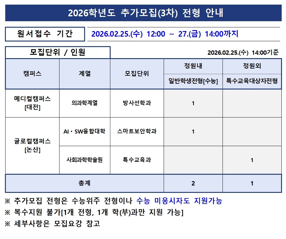| 제목 | 2026학년도 추가모집(3차) 모집요강 탑재 안내(2026.02.25) 이월반영 1차변동 | ||||
