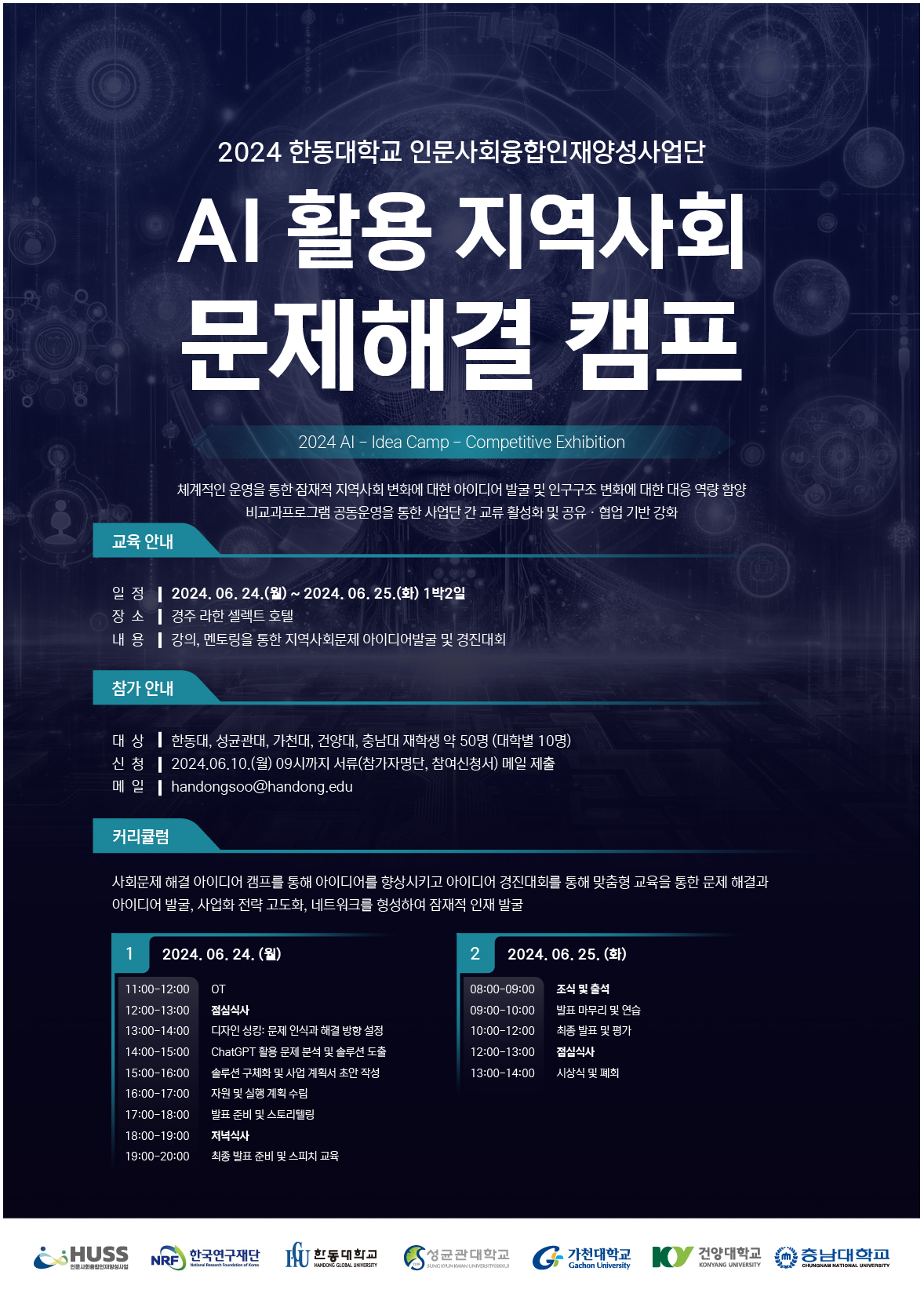 - 일정 및 장소: 6.24~25(1박 2일), 경주라한셀렉트호텔 - 모집 인원 : 총 10명 - 내용 : 성균관대, 가천대, 충남대, 한동대 학생들과 함께 강의, 멘토링을 통한 지역사회 문제 아이디어 발굴 및 경진대회 - 비용 : 무료 - 제출 서류 : 참여신청서 - 모집 기간 : 6.7 14시까지, kimms1748@konyang.ac.kr