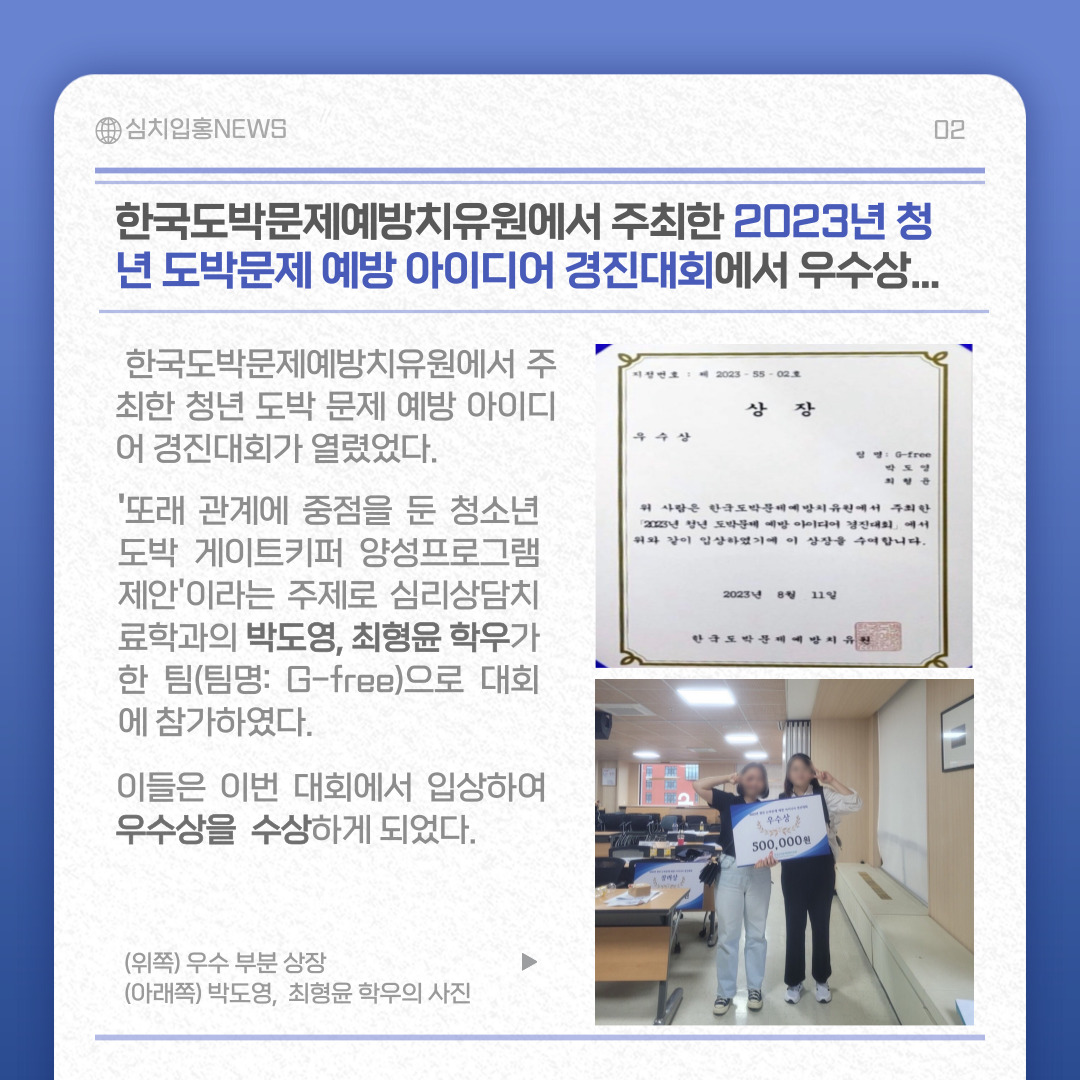 『 심리상담치료학과 학우 대회 및 공모전 수상 』글의 상세내용을 확인하는 표로 제목, 부서명, 등록일, 조회, 첨부, 내용으로 나뉘어 설명합니다.