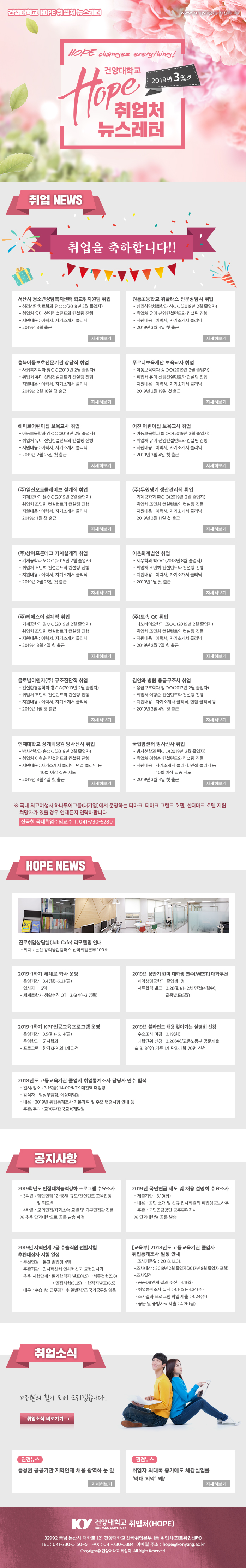 『 취업처 뉴스레터) 건양대학교 Hope 3월호 』글의 상세내용을 확인하는 표로 제목, 부서명, 등록일, 조회, 첨부, 내용으로 나뉘어 설명합니다.
