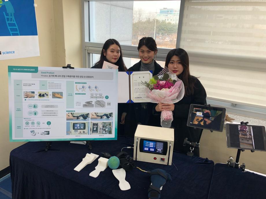 건양대 물리치료학과 박대성 교수와 윤은균, 송혜진, 유희주 학생은 교육부 CK-1(지방대 특성화사업) STEM 사업단 과제를 통해 개발한 <손가락 뼈 사이 관절 구축환자를 위한 공압을 이용한 손 운동장치 개발> 프로젝트를 응모해 우수상과 함께 부상으로 상금 백만원을 받았다. |