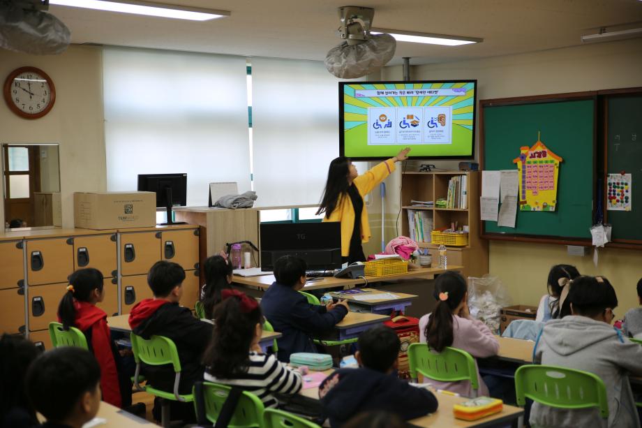 18일 내동초 학생들을 대상으로 장애인 체험교육을 하고 있는 건양대 재학생의 모습.jpg