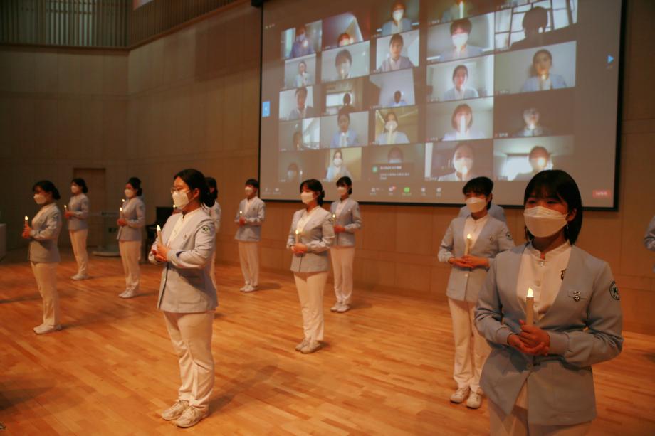 지난해까지는 간호대학 예비 졸업생 전원이 참석했으나 올해는 코로나19로 인해 현장에는 20명의 학생만 배석하고 나머지 148명의 학생들은 각자 자택에서 동영상 앱인 줌을 통해 온라인으로 참여했다.