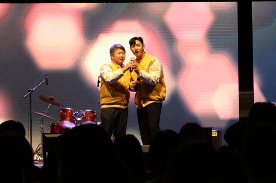 27일 밤 한솔대동제 개회식에서 이준혁 총학생회장과 함께 개회선언을 하는 김용하 총장(왼쪽).jpg