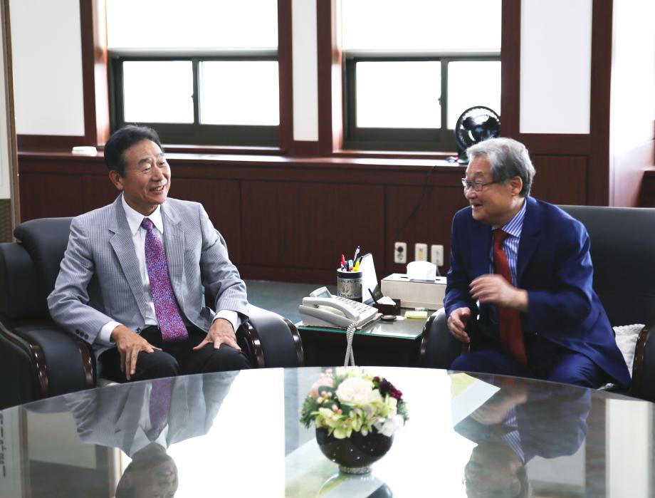 사토 요지 이사장(왼쪽)이 정연주 건양대 총장을 예방해 환담하는 모습.jpg