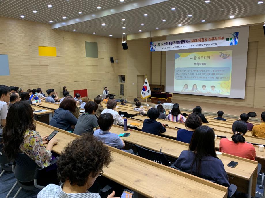 ‘논산계룡 진로활동체험처 MOU 체결 및 실무자 역량강화 연수’ 실시 논산계룡 진로직업체험지원센터(센터장 허용도)가 지난 24일 오후 논산 건양대학교 창의융합캠퍼스에서 교육부의 진로체험지원 전산망 “꿈길‘에 신규로 등록된 관내 22개 기관과 MOU를 체결하고 기존 및 신규 진로활동체험처 실무자 109명을 대상으로 연수를 실시했다. 안정적인 진로활동체험처 확보와 실무자들의 역량강화를 목적으로 시행된 이번 행사에는 드론조종사, 바리스타, 피오피공예 등 다양한 직종의 기관이 진로활동체험처로 신규 등록해 MOU에 참가했다. 또 초·중·고 학생들의 안전하고 내실 있는 진로활동체험 방안을 마련하기 위해 논산소방서 현장대응단 구급팀의 임성호 소방장과 논산 기민중학교 진로진학상담교사 현혜정 씨가 ‘체험활동 중 응급처치 요령’과 ‘학교에서 바라는 진로체험 운영방안’이란 주제로 각각 강의를 진행했다. 허용도 논산계룡 진로직업체험지원센터장은 “많은 초·중·고등학생들이 대학생이 되어서도 자신의 진로를 설정하지 못해 중도탈락 발생률이 늘어가고 있는 현재의 상황에 청소년기에 다양한 진로활동체험을 통해 자신의 흥미와 재능을 발견해가는 과정은 매우 중요하다고 할 수 있다”며 “각자 고유의 업무가 있음에도 청소년들의 진로교육을 위해 소중한 시간과 재능을 나누어 주는 우리 지역 다양한 기관 및 일터의 담당자들에게 감사의 마음을 전한다”고 소감을 밝혔다. 한편 논산계룡 진로직업체험지원센터는 논산계룡교육지원청에서 2015년 건양대학교에 위탁하여 운영되어오고 있으며, 지역의 진로활동체험처 발굴 및 질적 관리, 진로체험프로그램 컨설팅, 전문직업인 진로 멘토단 발굴 및 운영 등 지역의 진로체험 지원 업무를 수행하고 있다.