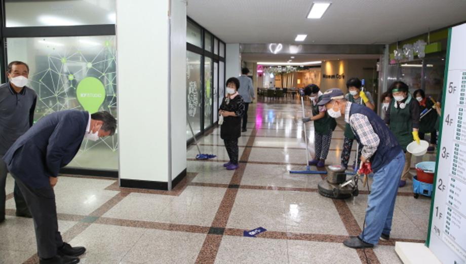 [사진설명] 사진 1. 9일 임기 첫 업무로 교내에서 바닥 왁스작업을 진행하는 환경미화직원을 찾아 인사하는 김용하 건양대 총장(왼쪽)