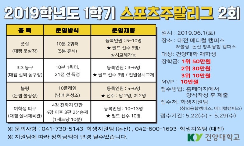 | 제목 | 2019학년도 제2회 스포츠주말리그 참가자 모집 공고(참가비 무료) | ||||