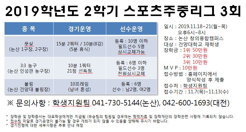 | 제목 | 2019학년도 제3회 스포츠주중리그 참가자 모집 공고(참가비 무료) | ||||