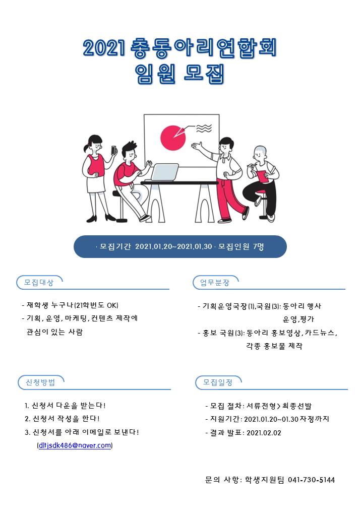 안녕하세요! 2021학년도 총동아리연합회 『단비』 입니다. 개교 30주년 행사 및 동아리 활성화를 위해 힘써주실 <총동아리연합회 임원>을 모집하려 합니다. 임원들은 동아리 제반 활동, 기획, 운영 등 관련 사항 심의, 분과별 대회 관련 회의 등 적극적인 자치 활동이 가능합니다. 모집 중인 인원은 총 7명으로 <기획운영국장(1) 기획운영국원(3) 홍보국원(3)>입니다. 지원을 희망하는 분은 첨부된 지원서를 다운받아 아래의 이메일로 보내주시길 바랍니다. 메일주소: dltjsdk486@naver.com (한글로 이선아486) 임원 지원과 관련하여 문의할 사항이 있다면 학생지원팀 (041-730-5144) 으로 연락주시면 감사하겠습니다 :) 많은 지원 부탁드립니다. 감사합니다.