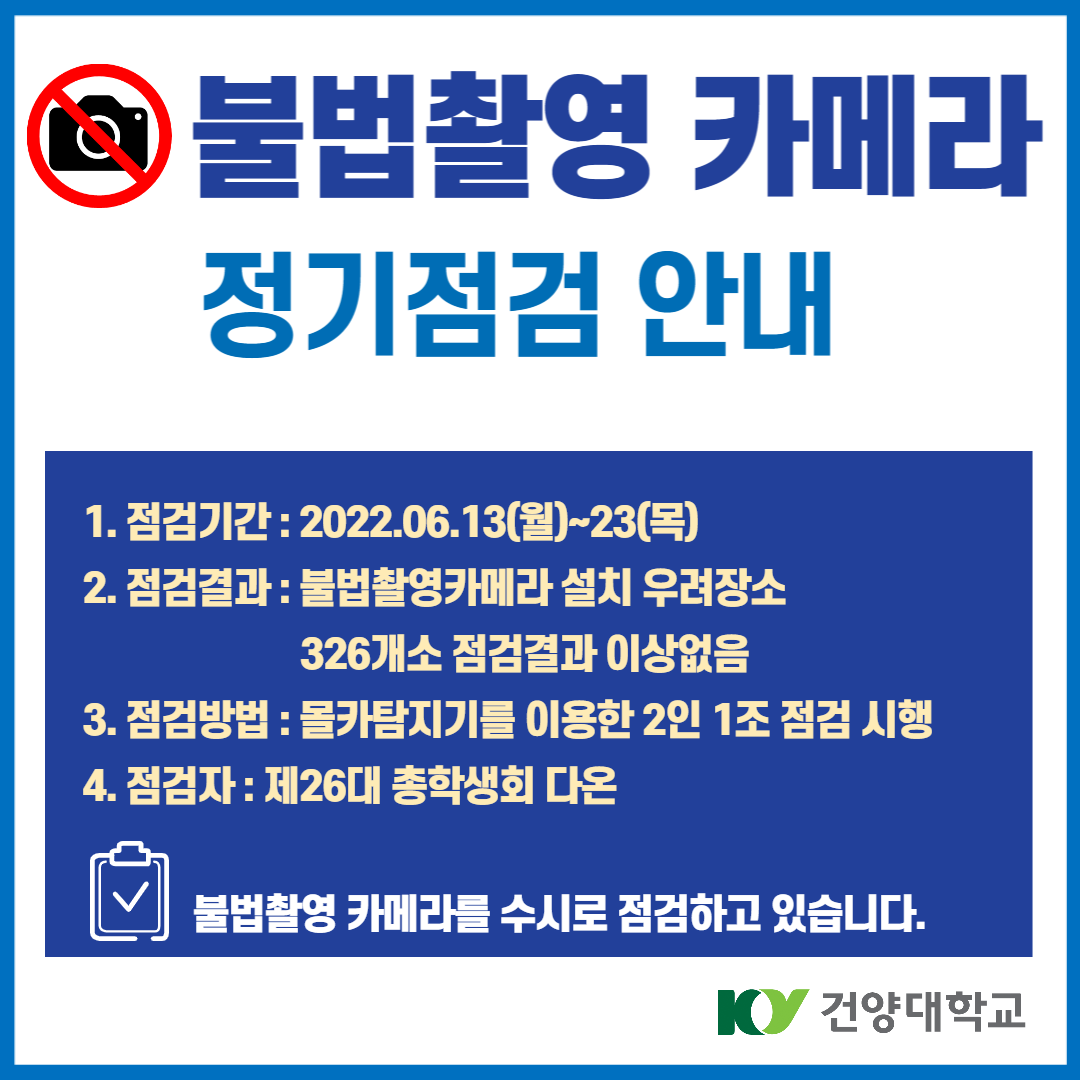 | 제목 | 2022학년도 1학기 불법촬영 카메라 정기점검 안내 | ||||