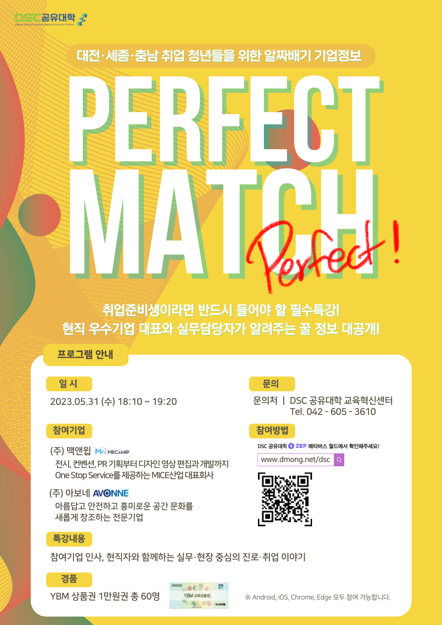 | 제목 | [DSC 공유대학] 산업체 인사특강:Perfect Match 3회차 안내 | ||||