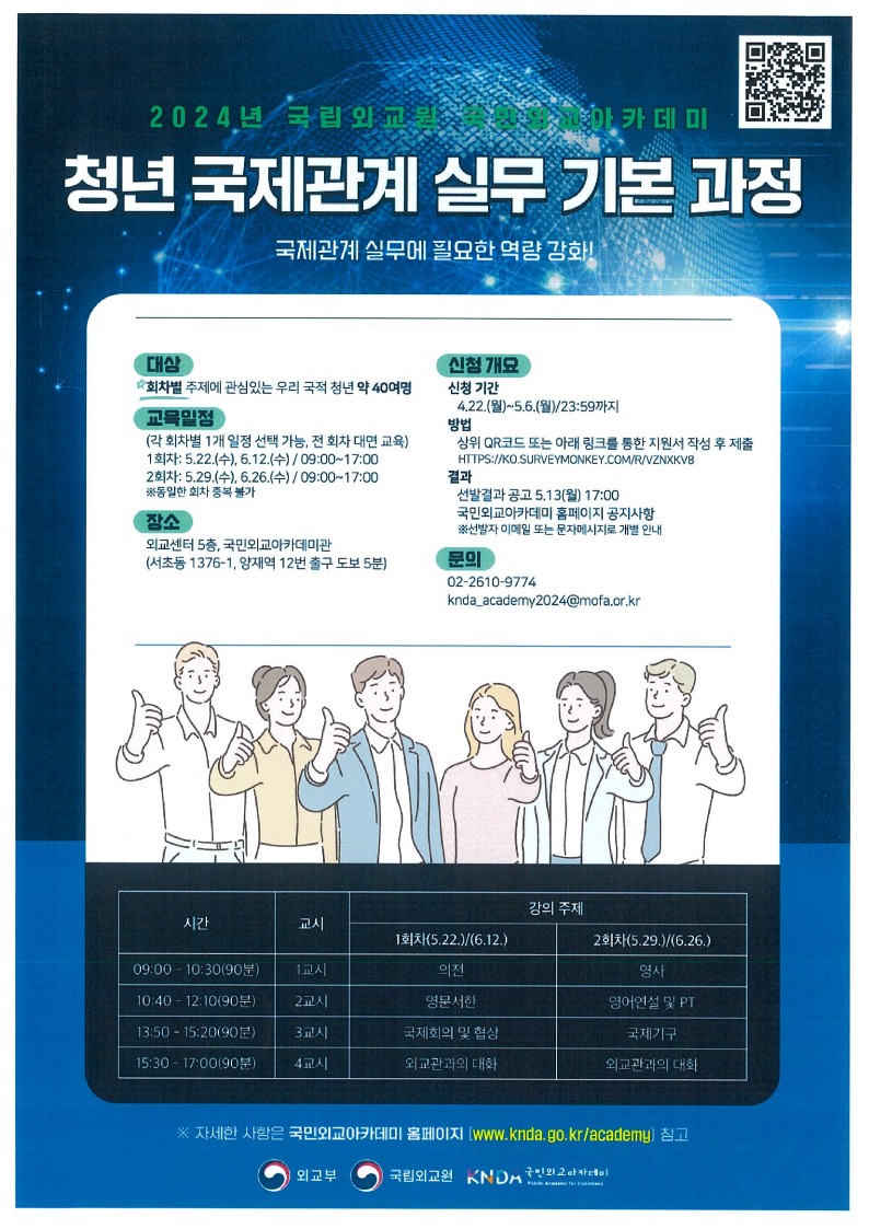 | 제목 | 2024년 국립외교원 국민외교아카데미 청년 국제관계 실무 기본과정 참가자 모집 홍보 | ||||