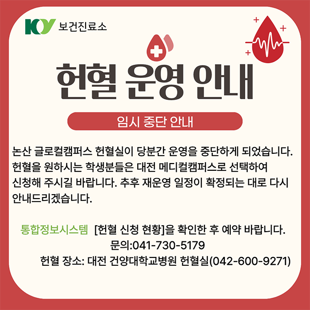 | 제목 | 논산 글로컬캠퍼스 헌혈 운영 임시 중단 안내 | ||||