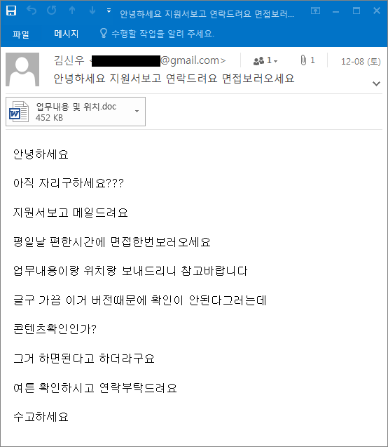 최근, 국내를 대상으로 이메일을 이용한 악성 공격이 확산되고 있습니다. 국내의 경우 대부분 ‘갠드크랩 랜섬웨어’ 감염 및 정보탈취를 목적으로 해당 공격이 진행되고 있으며 몇일전에는 ‘국방위원’을 사칭하는 등 공격 기법 또한 점차 고도화 되고 있음을 확인 하였습니다. 이에 정보통신원에서는 최근 유포되고 있는 악성 메일로 인하여 교내 사용자의 추가적인 피해가 발생하지 않도록 최신 악성메일 패턴을 공유 드립니다. 아래 내용을 참조하시어 해당 메일 수신시 첨부파일 실행 및 열람을 지양하고 정보통신원으로 신고 부탁드립니다. ※ 현재 교내 사용중인 알약 백신을 통하여 최신 랜섬웨어(일부) 검출 및 차단이 가능하며 최신 업데이트 확인 부탁 드립니다. [그림1] 입사지원 및 면접관련 내용으로 위장한 악성 이메일(12.08)