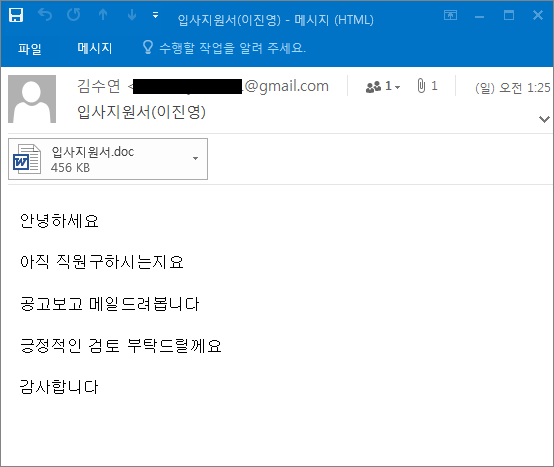 [그림2] 입사지원서 공고 내용으로 위장한 악성 이메일(12.09)