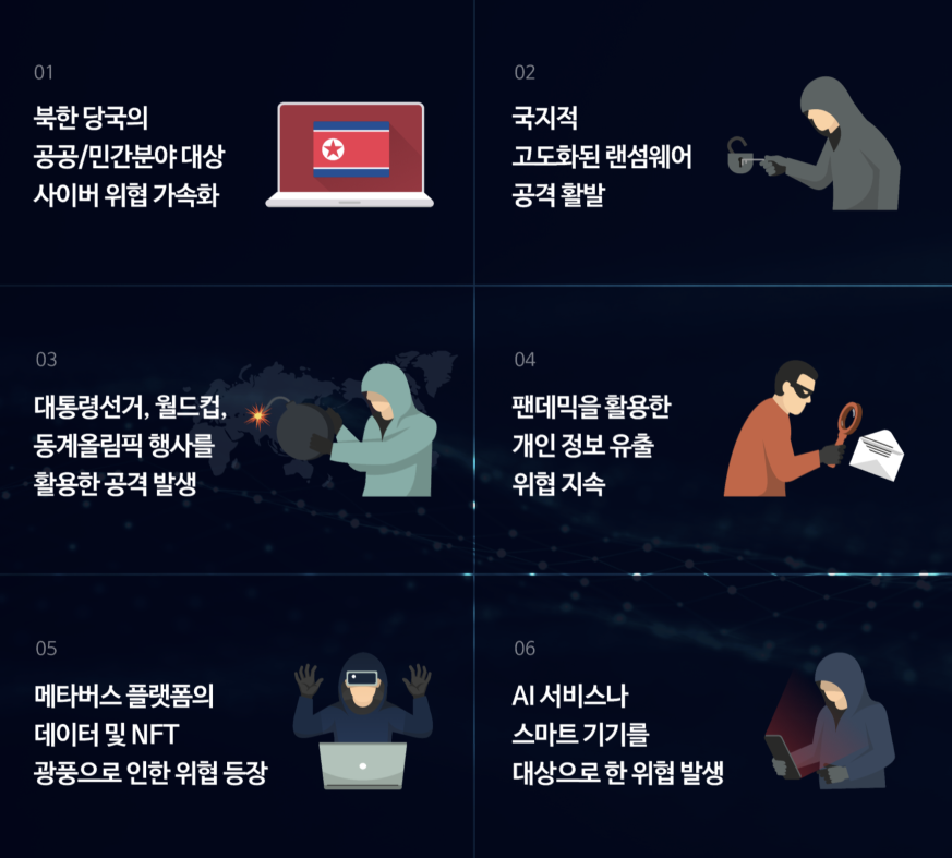 [그림1] 2022년 예상 보안 이슈 (출처 : 이스트 시큐리티 보안 블로그) 1. 북한 당국의 공공/민간분야 대상 사이버 위협 가속화 2022년 역시 북한의 대남 사이버 위협이 지속 될 것으로 예측되며 특히, 공공분야뿐만 아니라 민간 분야 전문 종사자를 대상으로 한 표적 공격도 가속화될 것으로 보입니다. 2. 국지적 고도화된 랜섬웨어 공격 활발 기업용 소프트웨어, 운영체제 취약점 등을 악용한 맞춤형 ‘랜섬웨어’의 유포와 내부 정보를 유출하는 공격이 광범위하게 발생할 것으로 예상됩니다. 랜섬웨어 제작에서 유포까지 도와주는 서비스 형 랜섬웨어(RaaS) 방식은 더욱 성행할 것으로 보이며, 특히 지능형 지속공격(APT) 공격과 결합한 랜섬웨어 위협이 증가할 것으로 예상됩니다. 3. 대통령 선거 및 월드컵, 올림픽 등 국제 행사를 활용한 사회공학적 공격 발생 2022년은 베이징 동계올림픽, 항저우 아시안게임, 카타르 월드컵 등 국제적인 행사를 비롯해 20대 대선이 진행되는 등 국내외적으로 큰 이슈가 예정되어 있어 이를 이용한 다양한 공격(피싱, 스미싱, APT 등)이 시도될 것으로 예상됩니다. 4. 팬데믹을 활용한 개인정보 유출 위협 지속 코로나19 팬데믹이 지속됨에 따라 위드 코로나와 관련된 ‘확진자 동선’, ‘소상공인 지원 안내’, ‘백신접종 확인’ 등 관련 키워드를 사용한 이메일 피싱, 스미싱 등 종합적인 공격이 다수 발생할 것으로 예상됩니다. 또, 영화관 대신 집에서 영화나 드라마를 볼 수 있는 OTT 서비스(넷플릭스, 디즈니 플러스 등) 시장이 지속해서 성장함에 따라 가입 회원의 아이디, 암호, 결제정보 등 개인정보를 겨냥한 위협이 나타날 것으로 보입니다. 5. 메타버스 플랫폼의 데이터 및 NFT 광풍으로 인한 위협 등장 메타버스는 가상의 공간에서 창조된 자신의 아바타를 통해 블록체인 기술을 기반으로 한 대체불가토큰(NFT)으로 가상 세계의 부동산 거래, 상품 거래 등 여러 경제활동을 할 수 있고, 이것이 곧 현실 세계의 전자 금융거래와도 연결 됩니다. 이 때문에 데이터 보호와 프라이버시 침해에 대한 위협 역시 대두될 것으로 예상됩니다. 6. AI 서비스나 스마트 기기를 대상으로 한 위협 발생 IoT와 AI의 발전에 따라 가정이나 기업에서 사용하는 스마트 시스템을 겨냥한 새로운 공격이 등장할 가능성이 증가될 것으로 예상됩니다. 다양한 가정용 스마트 인프라 환경을 겨냥한 공격이 발생할 것 으로 보여집니다.