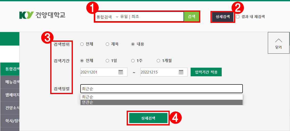 ■ 상세검색 ❶ 검색어 입력 → ❷ [상세검색] 버튼 클릭 → ❸ 검색범위,기간,정렬 선택 → ❹ 하단 [상세검색] 버튼 클릭