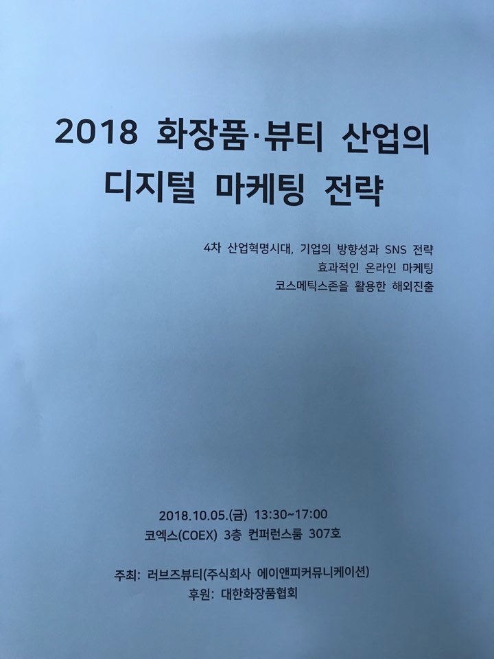 마지막으로 2018 화장품·뷰티 산업의 디지털 마케팅 전략에 대한 강연을 들었습니다! 4차 산업혁명시대, 기업의 방향성과 SNS전략, 효과적인 온라인 마케팅, 코스메틱존을 활용한 해외 진출에 대한 주제들로 진행되었습니다! 아주 유익한 시간들이었어요.