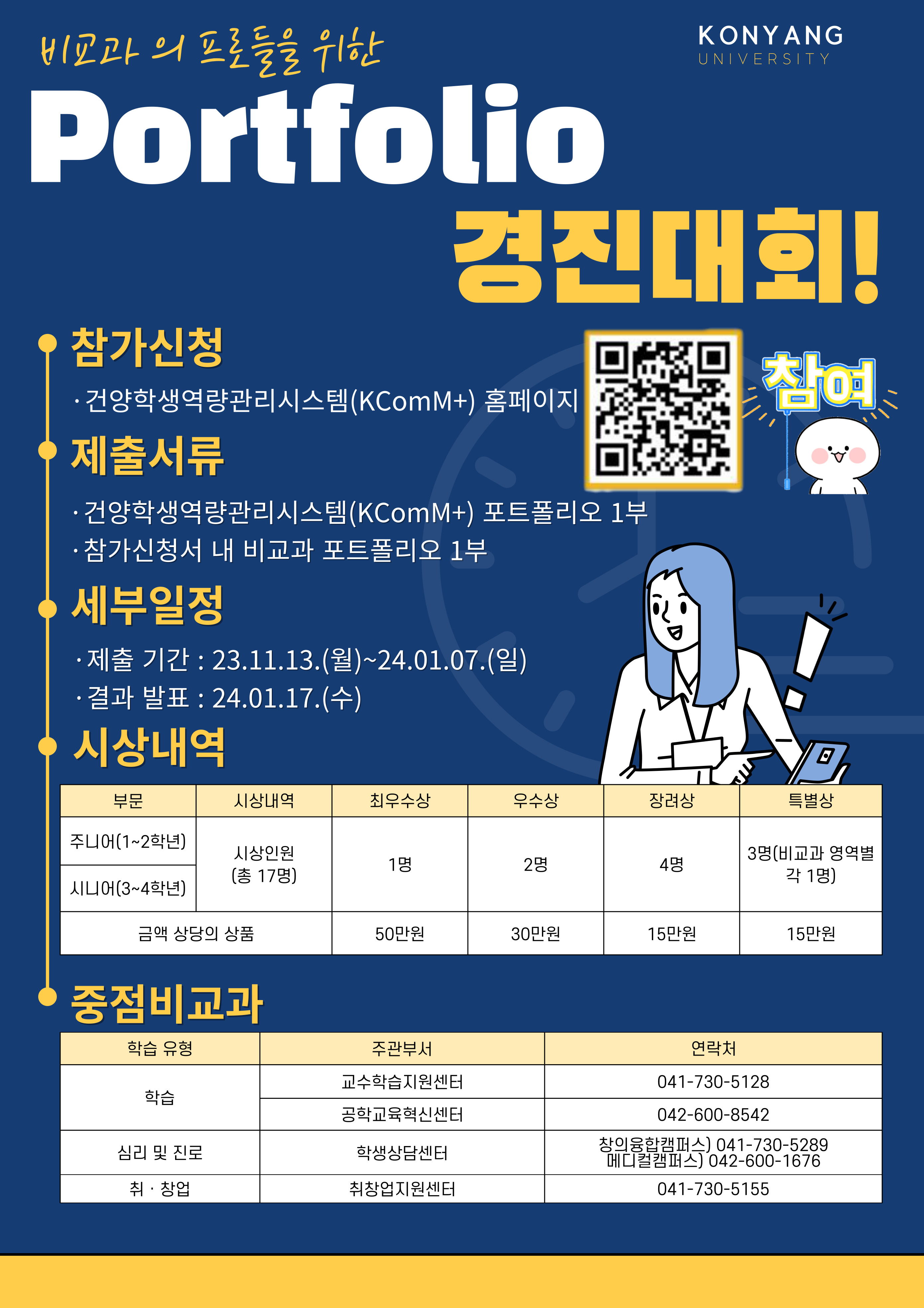 "2023학년도 2학기 비교과 포트폴리오 경진대회 안내" 1. 프로그램명 : 2023학년도 2학기 비교과 포트폴리오 경진대회 2. 상세내용 - 신청대상 : 재학생 전학년(휴학생, 대학원 생 제외) - 신청기간 : 2023.11.13.(월)~2024.01.07.(일) - 신청방법 1) 중점 비교과 프로그램 이수 2) 건양학생역량관리시스템(KComM+) 마이페이지 포트폴리오 PDF 출력 후 제출 3) 참가신청서 내 비교과 포트폴리오 프로그램 3개이상 작성 후 제출 - 시상내역
