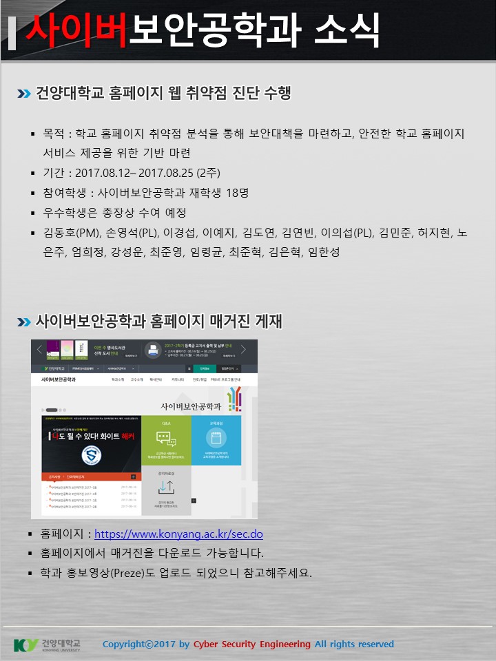 『 사이버보안공학과 보안매거진 2017-6호 』글의 상세내용을 확인하는 표로 제목, 부서명, 등록일, 조회, 첨부, 내용으로 나뉘어 설명합니다.