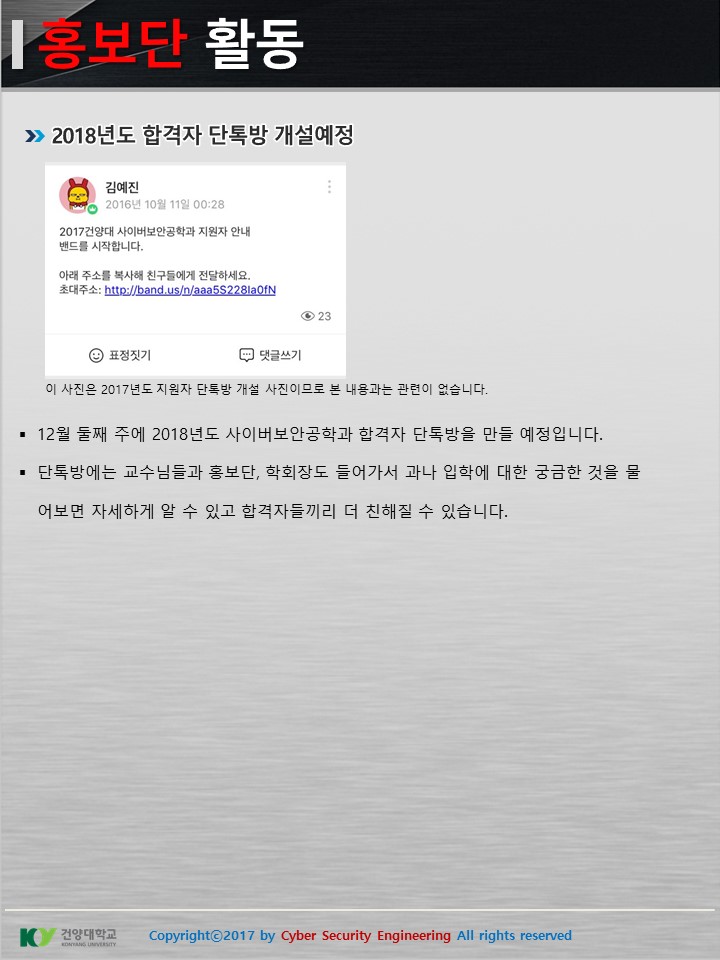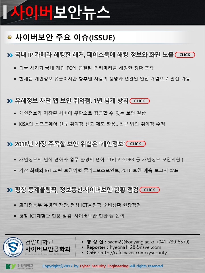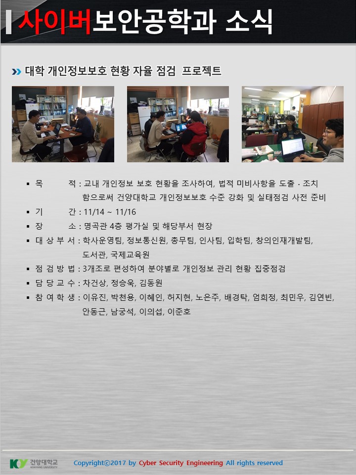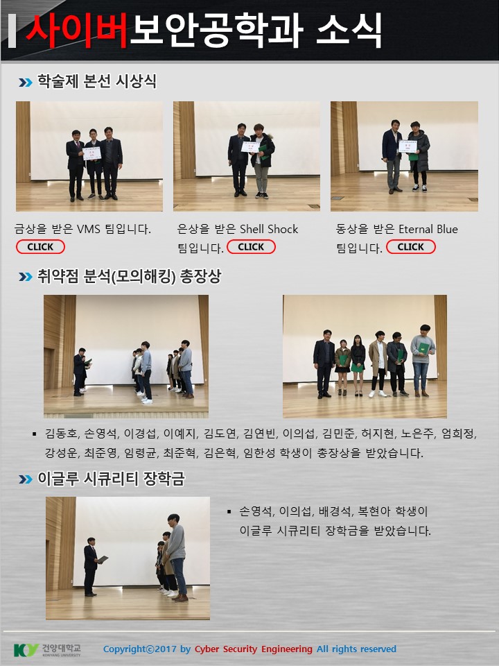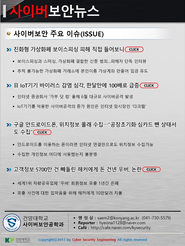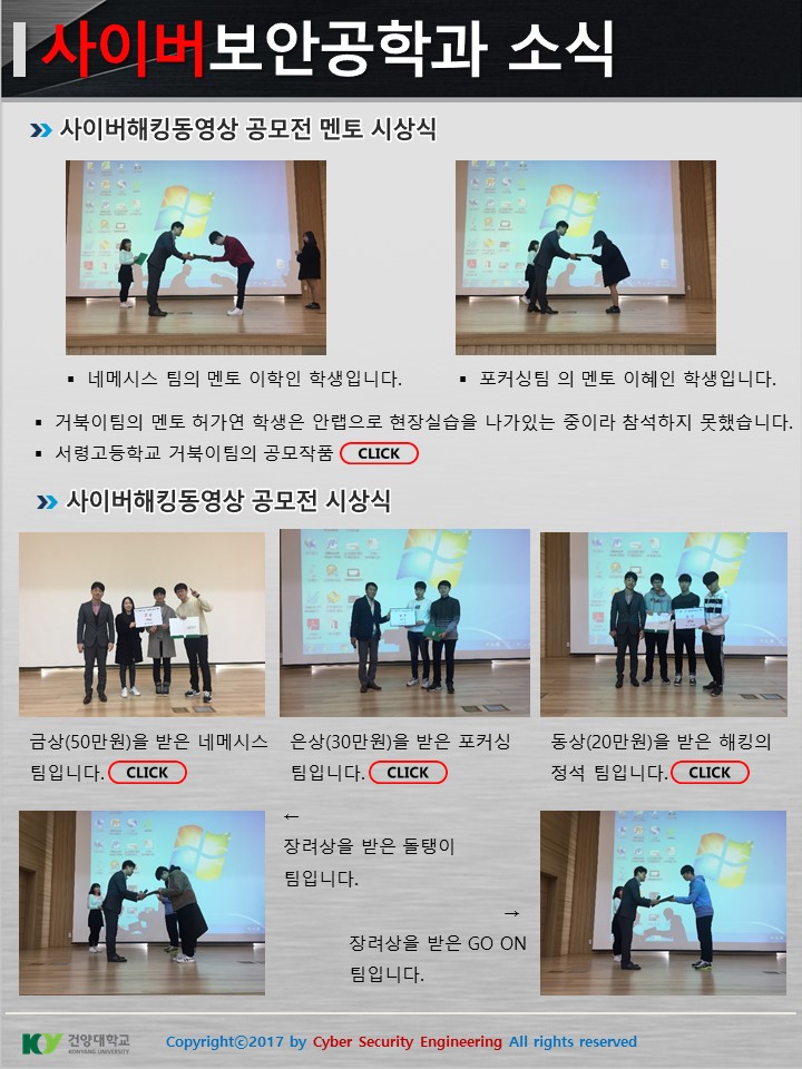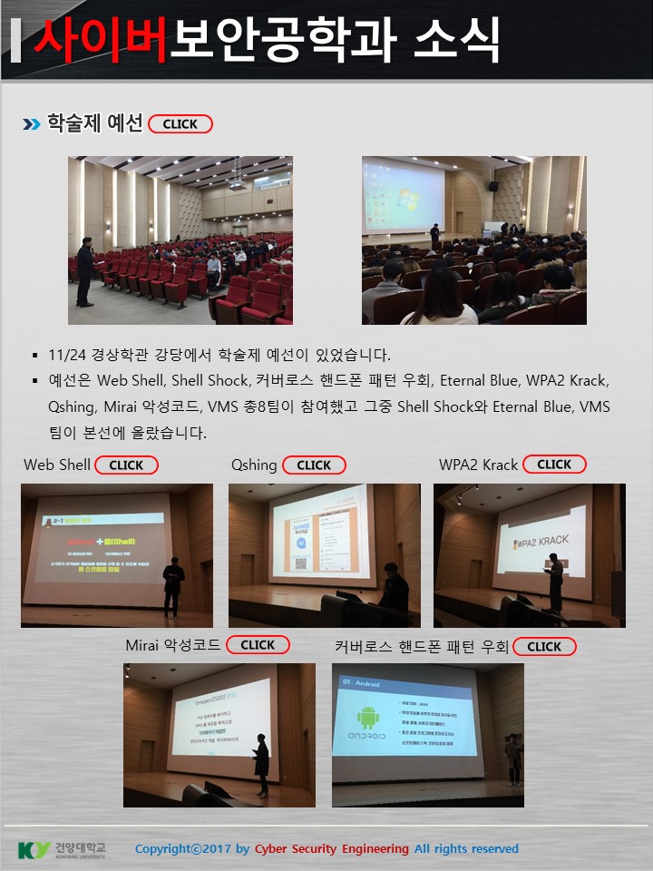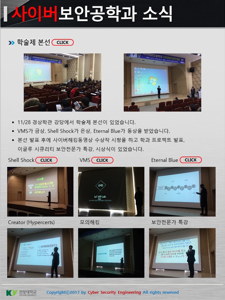 『 사이버보안공학과 보안매거진 2017-10호 』글의 상세내용을 확인하는 표로 제목, 부서명, 등록일, 조회, 첨부, 내용으로 나뉘어 설명합니다.