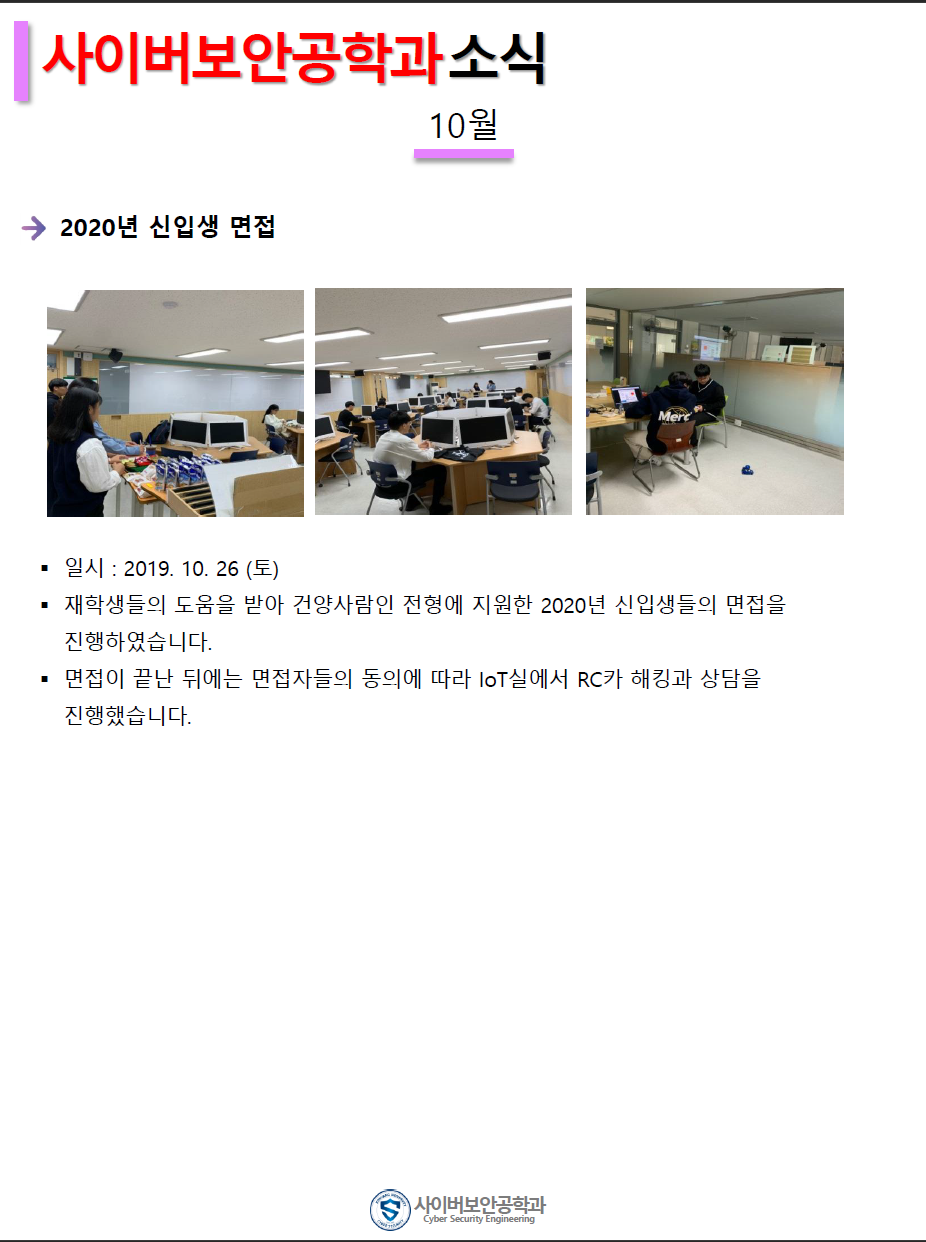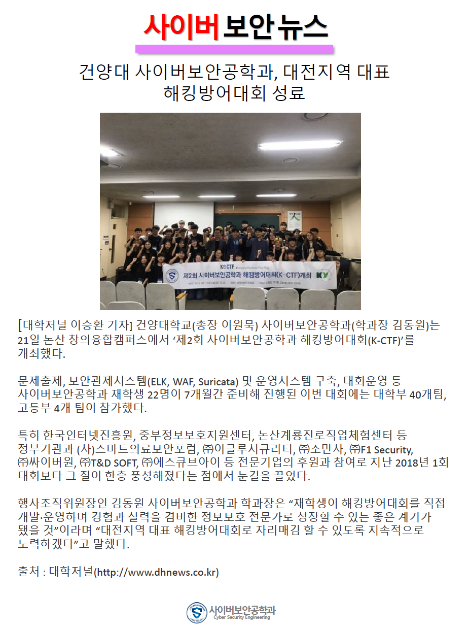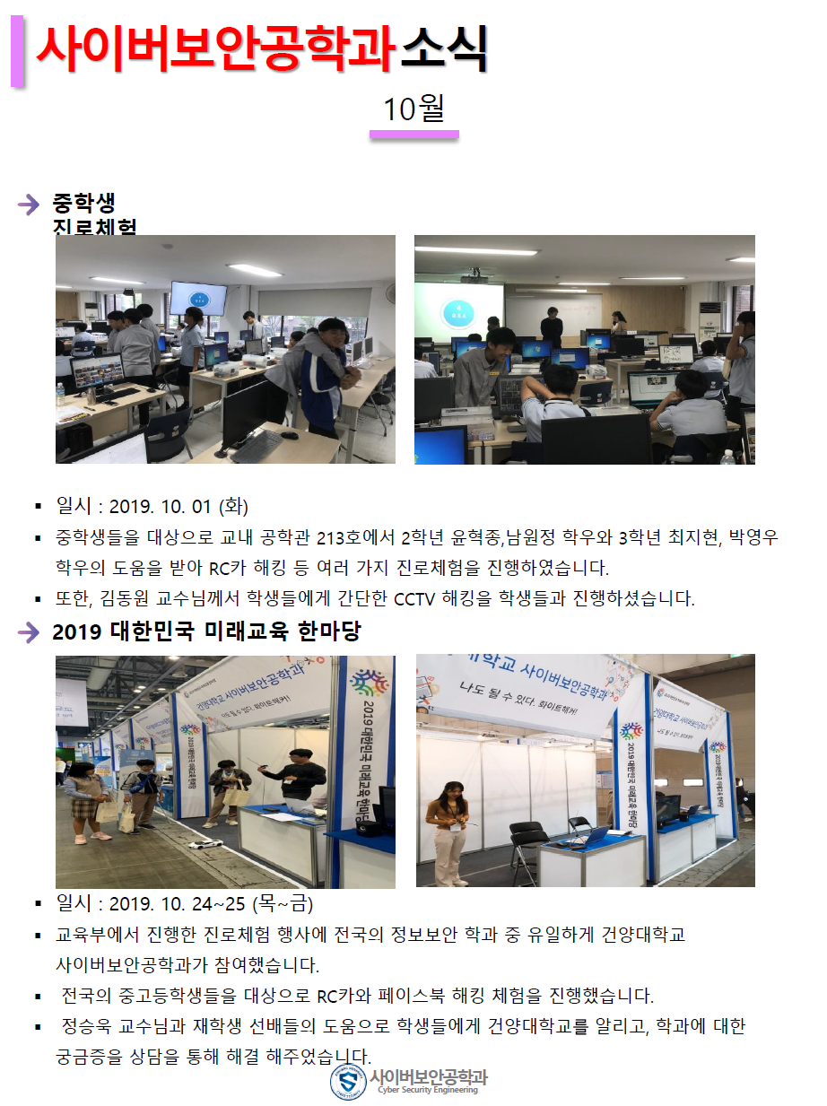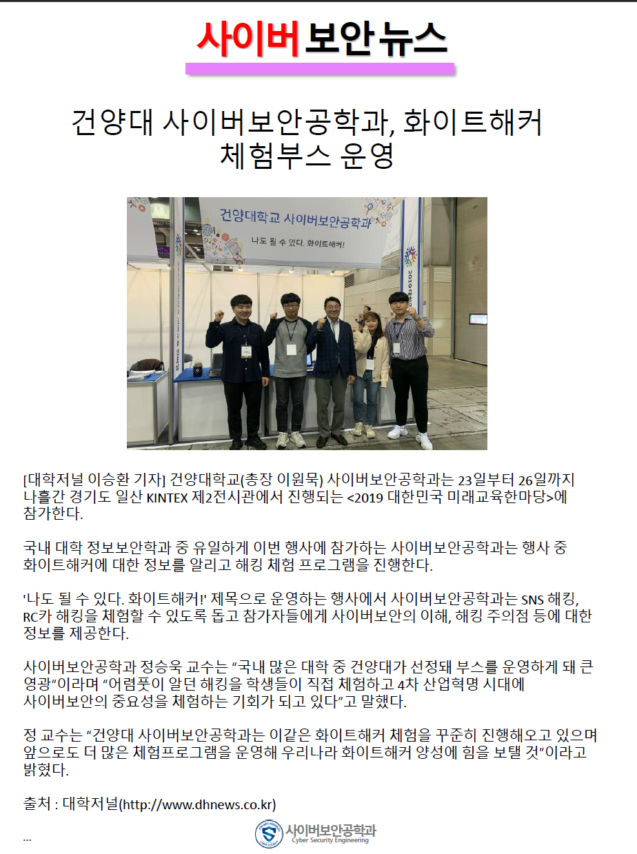 『 사이버보안공학과 보안매거진 2019-4호 』글의 상세내용을 확인하는 표로 제목, 부서명, 등록일, 조회, 첨부, 내용으로 나뉘어 설명합니다.