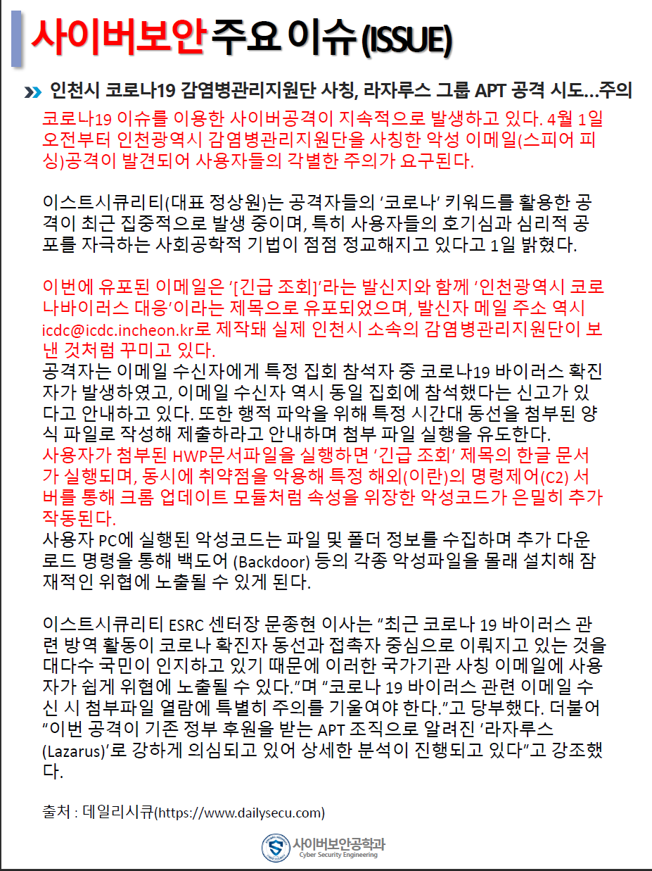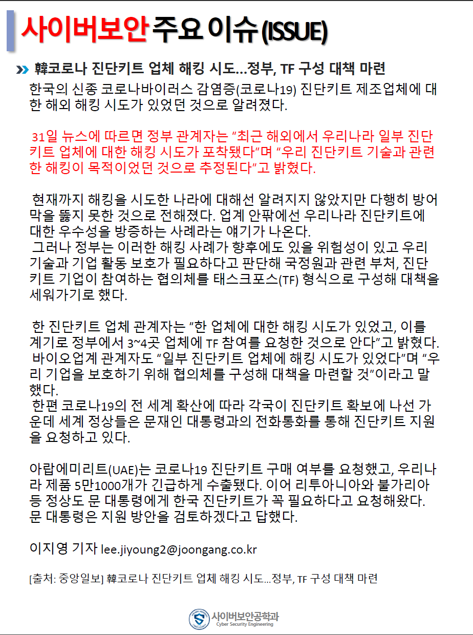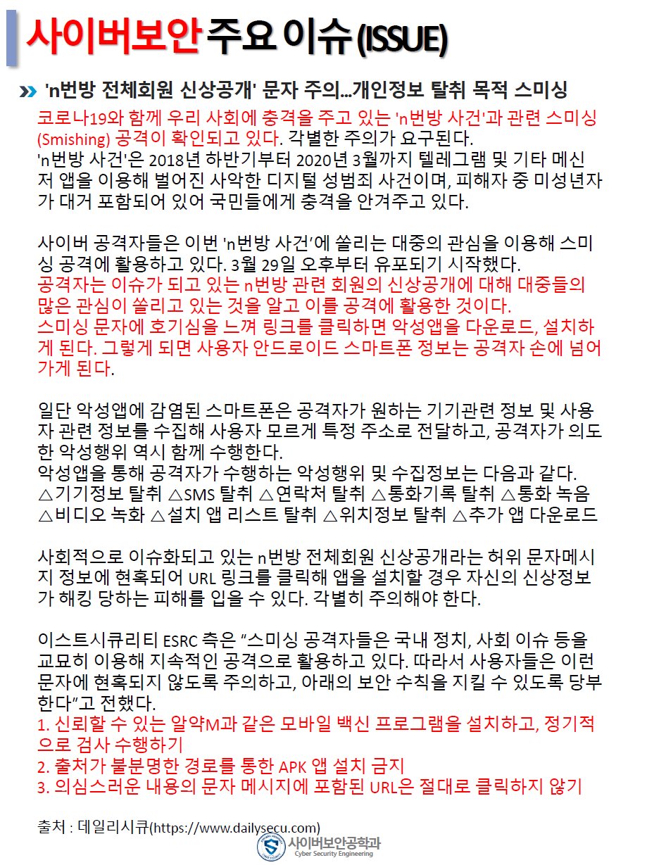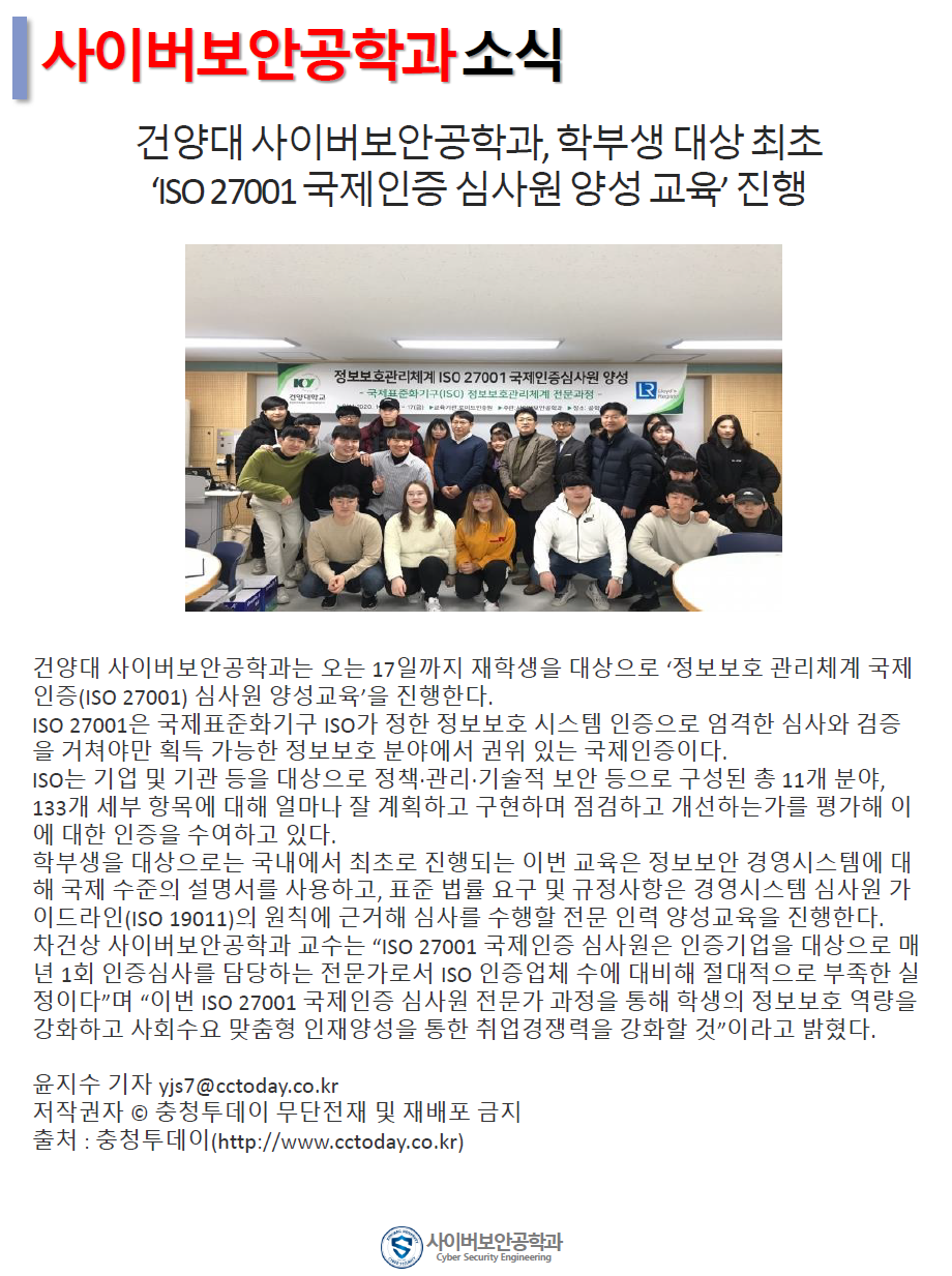 『 사이버보안공학과 보안매거진 2020-1호 』글의 상세내용을 확인하는 표로 제목, 부서명, 등록일, 조회, 첨부, 내용으로 나뉘어 설명합니다.