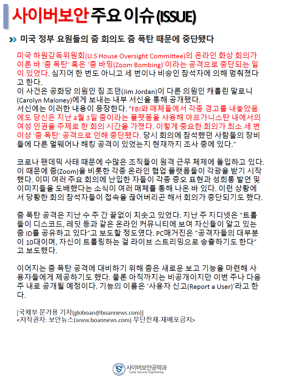 『 사이버보안공학과 보안매거진 2020-2호 』글의 상세내용을 확인하는 표로 제목, 부서명, 등록일, 조회, 첨부, 내용으로 나뉘어 설명합니다.