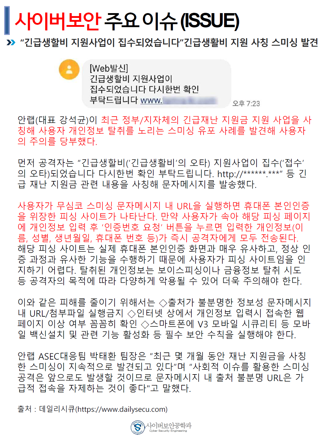 『 사이버보안공학과 보안매거진 2020-4호 』글의 상세내용을 확인하는 표로 제목, 부서명, 등록일, 조회, 첨부, 내용으로 나뉘어 설명합니다.