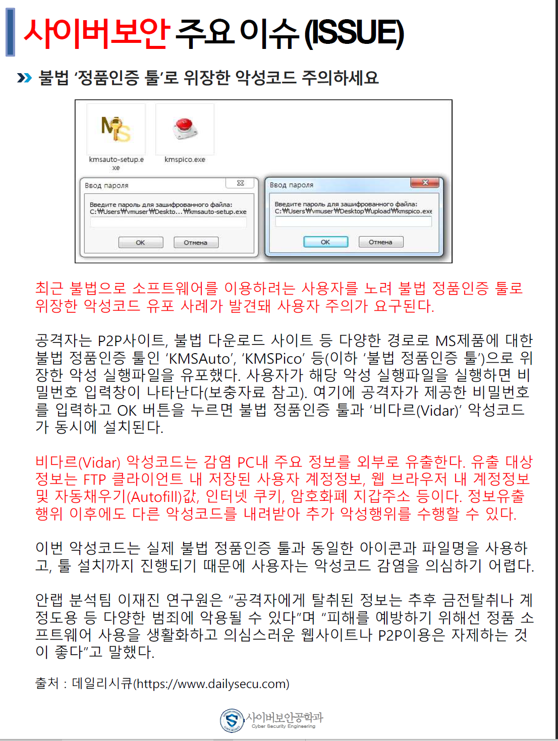 『 사이버보안공학과 보안매거진 2020-4호 』글의 상세내용을 확인하는 표로 제목, 부서명, 등록일, 조회, 첨부, 내용으로 나뉘어 설명합니다.