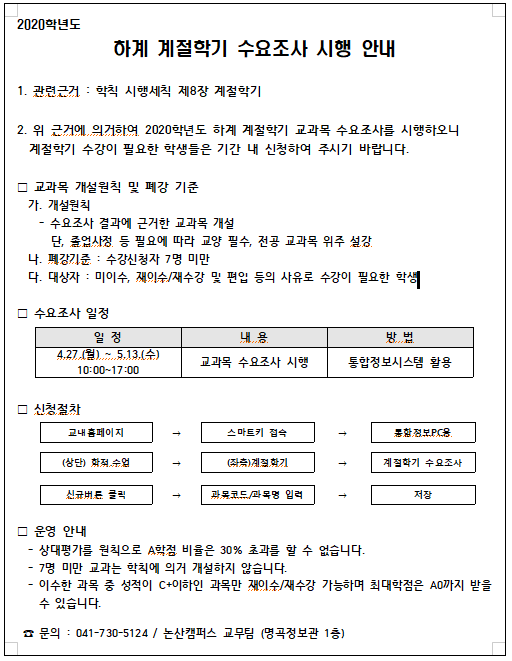 | 제목 | 2020학년도 하계 계절학기 수요조사 시행 안내 | ||||