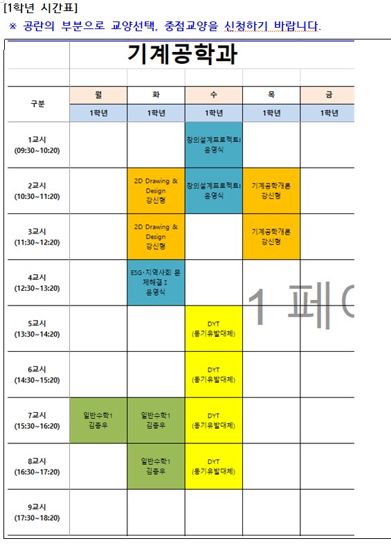 중요 : 2023.03.02(목) 10:00에 수강신청을 시작하기 바랍니다. 선착순입니다. - 추가안내1 : 교양필수인 DYT 과목은 아래와 같이 인원수 제한이 있으니 프로그램 신청자가 모두 만석인 경우 여석의 프로그램을 신청 하기 듣기 바랍니다. ★ 제한인원 : 보컬 : 2명 / 숏품 1명 / 웹툰 5명 |