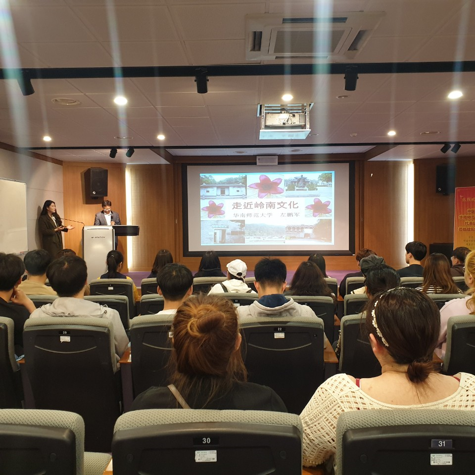자매대학인 중국 광주시 화남사범대학교의 국제문화대학 학장 일행이 우리 대학에 방문하였습니다. 左학장님은 저명한 중국영남문학 연구자로, 우리 학생들을 위해 '중국영남문화'를 주제로 특강을 해주셨으며, 2019년 현지 파견학습에 참여할 학생들을 위한 설명회도 진행하였습니다.