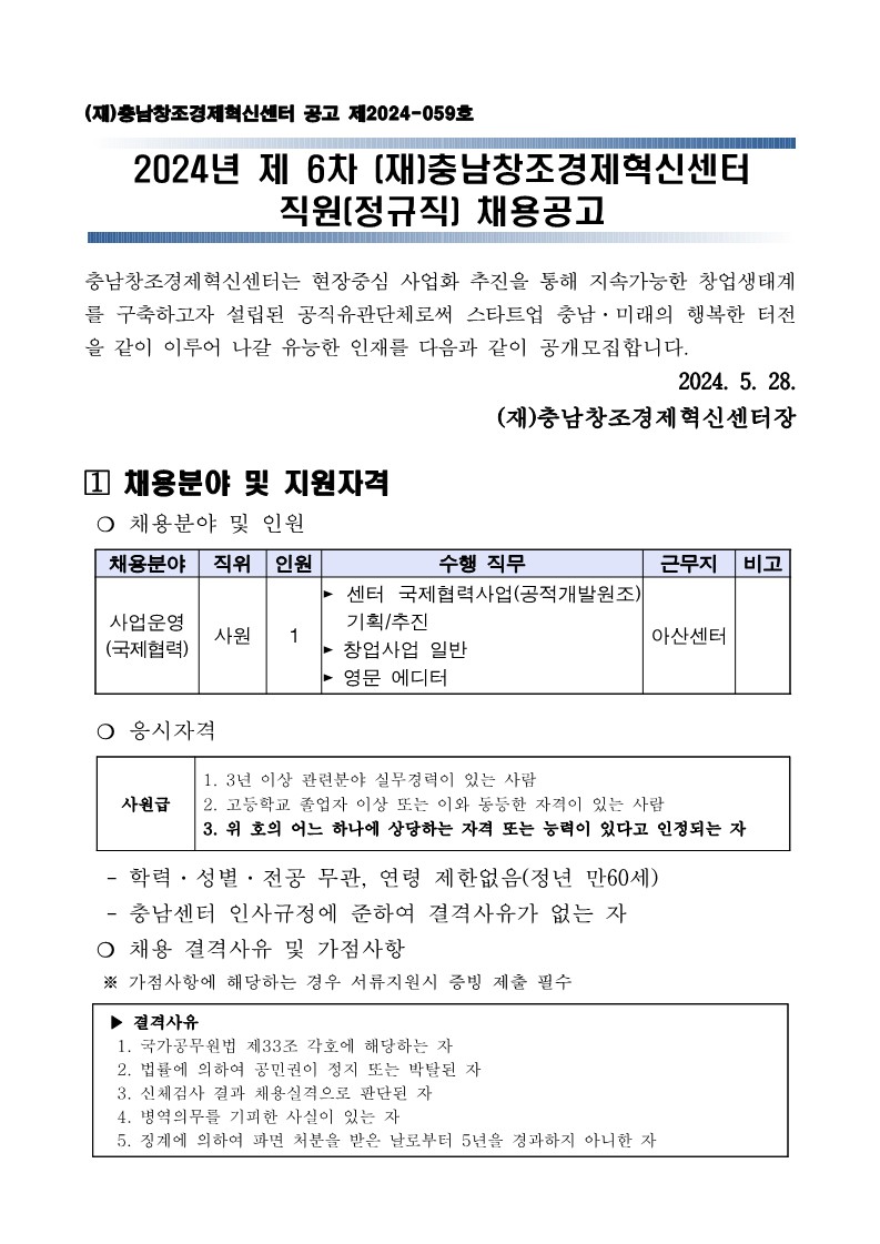 | 제목 | [충남창조경제혁신센터] 제 6차 직원(정규직) 채용(~6/11) | ||||