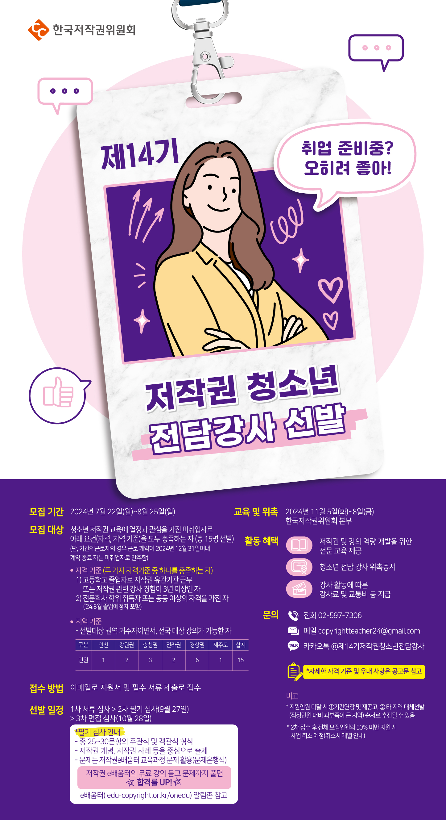 | 제목 | [한국저작권위원회] 제14기 청소년 전담강사 선발 안내(~8/25) | ||||