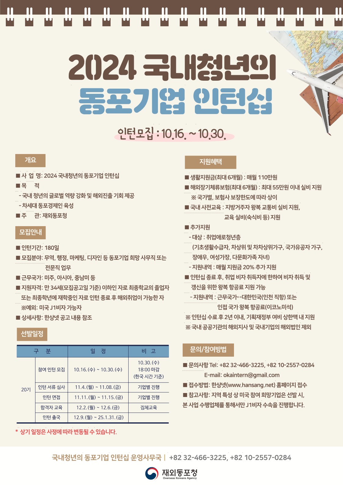 o 사 업 명 : 국내청년의 동포기업 인턴십 o 모집인원 : 30명 o 모집기간 : 2024.10.16.(수) ~ 10.30.(수) 18:00 o 인턴기간 : 180일 o 인턴직무 : 무역, 행정, 마케팅 등 동포기업별 요청 직무 o 기타 세부내용 : 붙임1. 모집공고문 참조