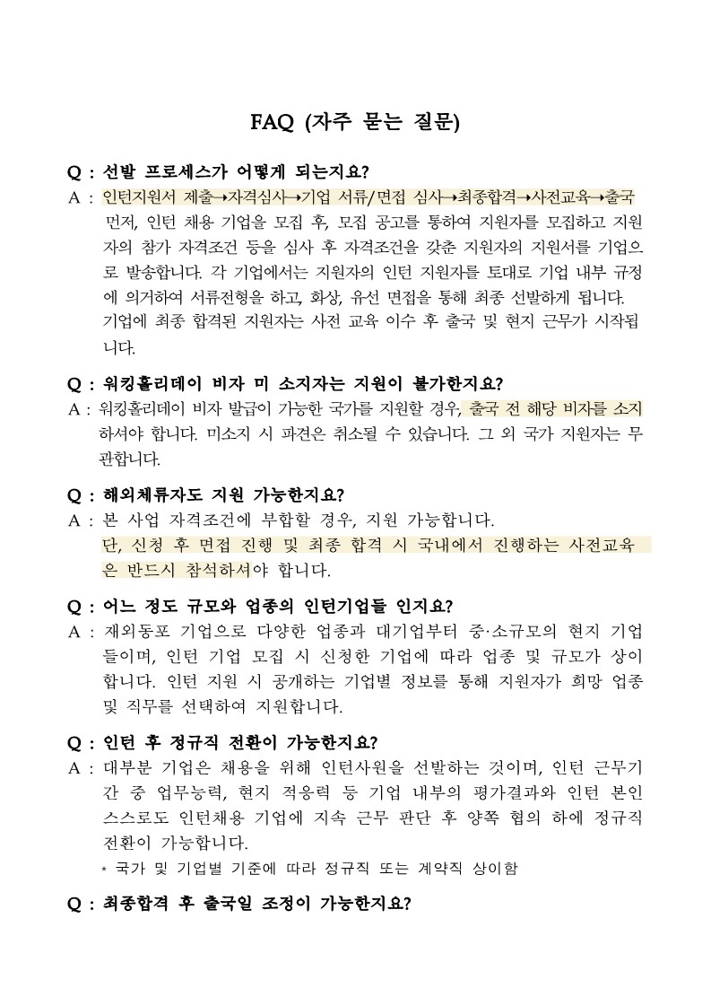 | 제목 | 2024년 국내청년의 동포기업 인턴십(2025년 상반기 근무) 인턴 모집(~10/30) | ||||