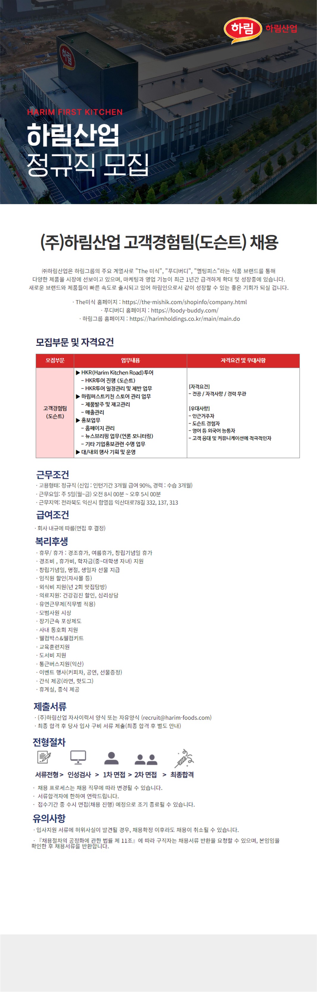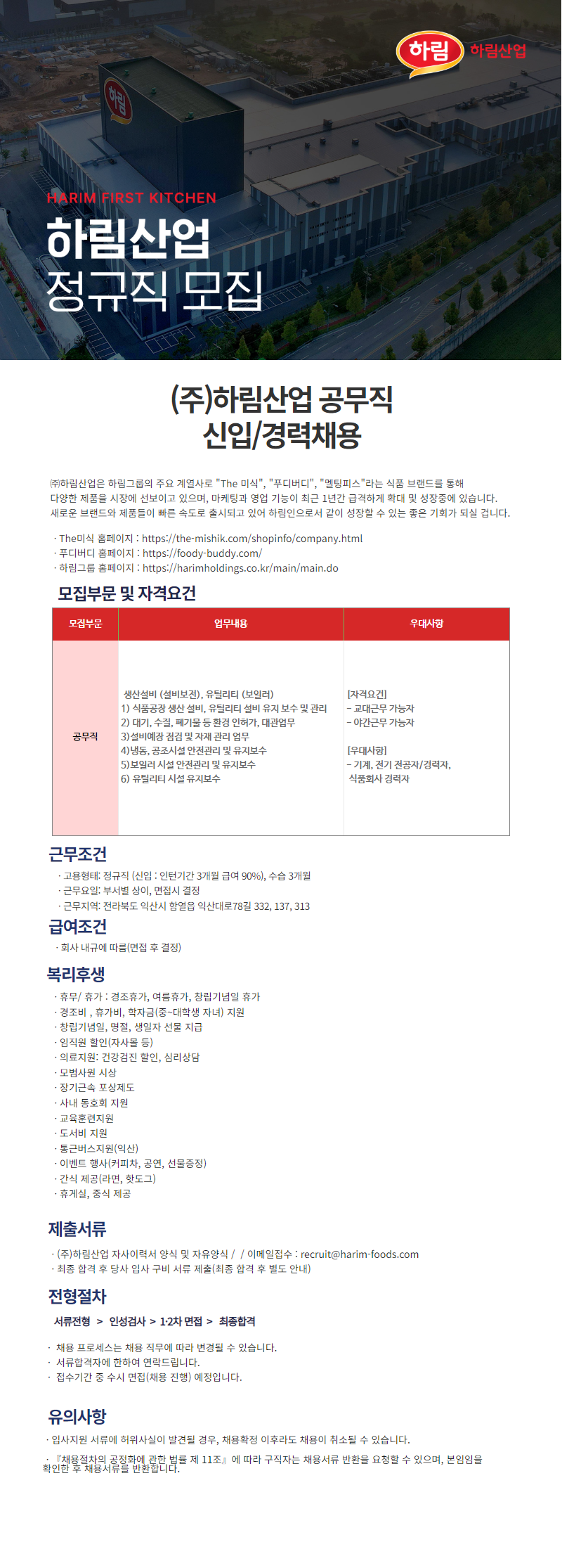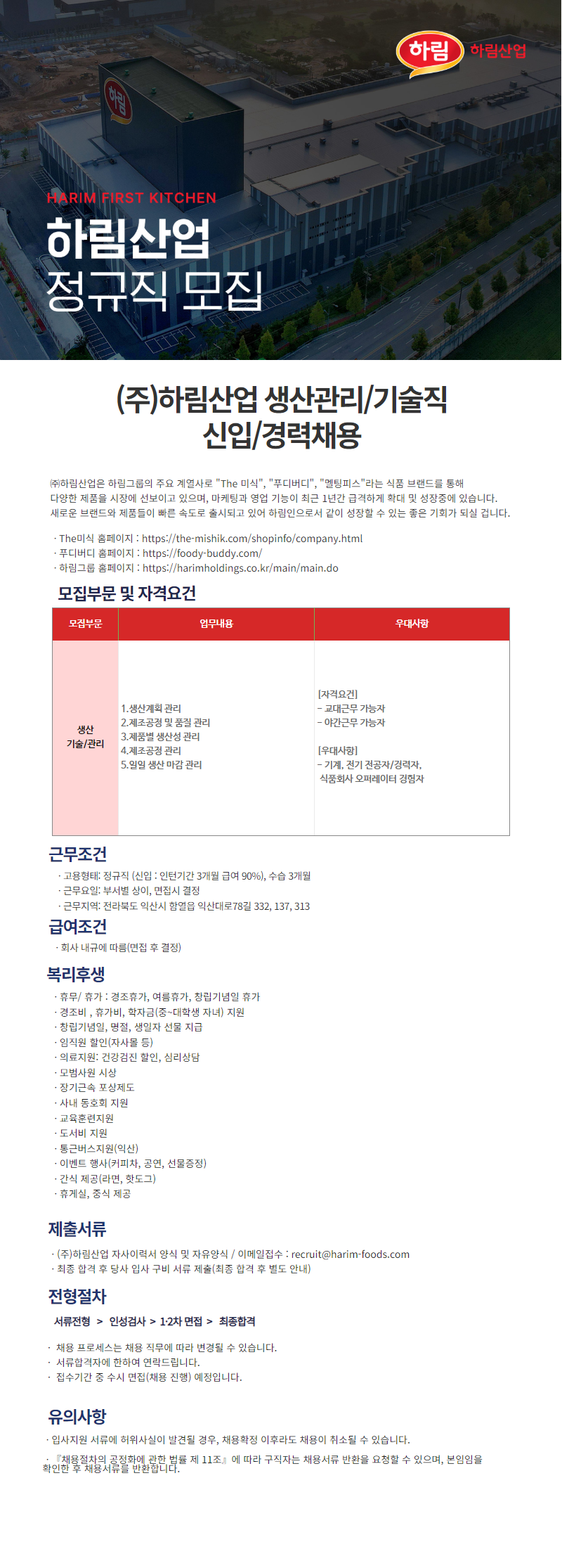 [지원방법] 이메일 지원 : recruit@harim-foods.com 하림산업 자사이력서 or 자유양식