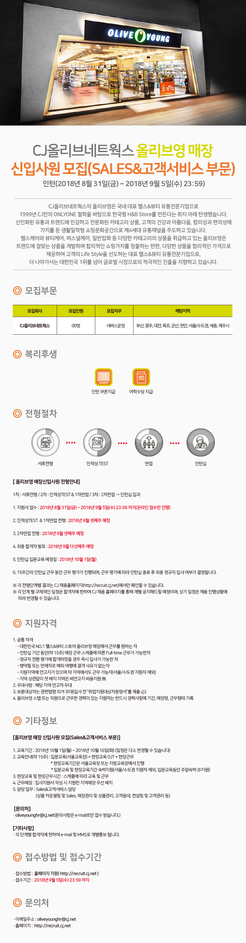 (~9/5)[CJ올리브네트웍스 올리브영]매장 신입사원 모집(SALES&고객서비스부문) 글의 상세내용