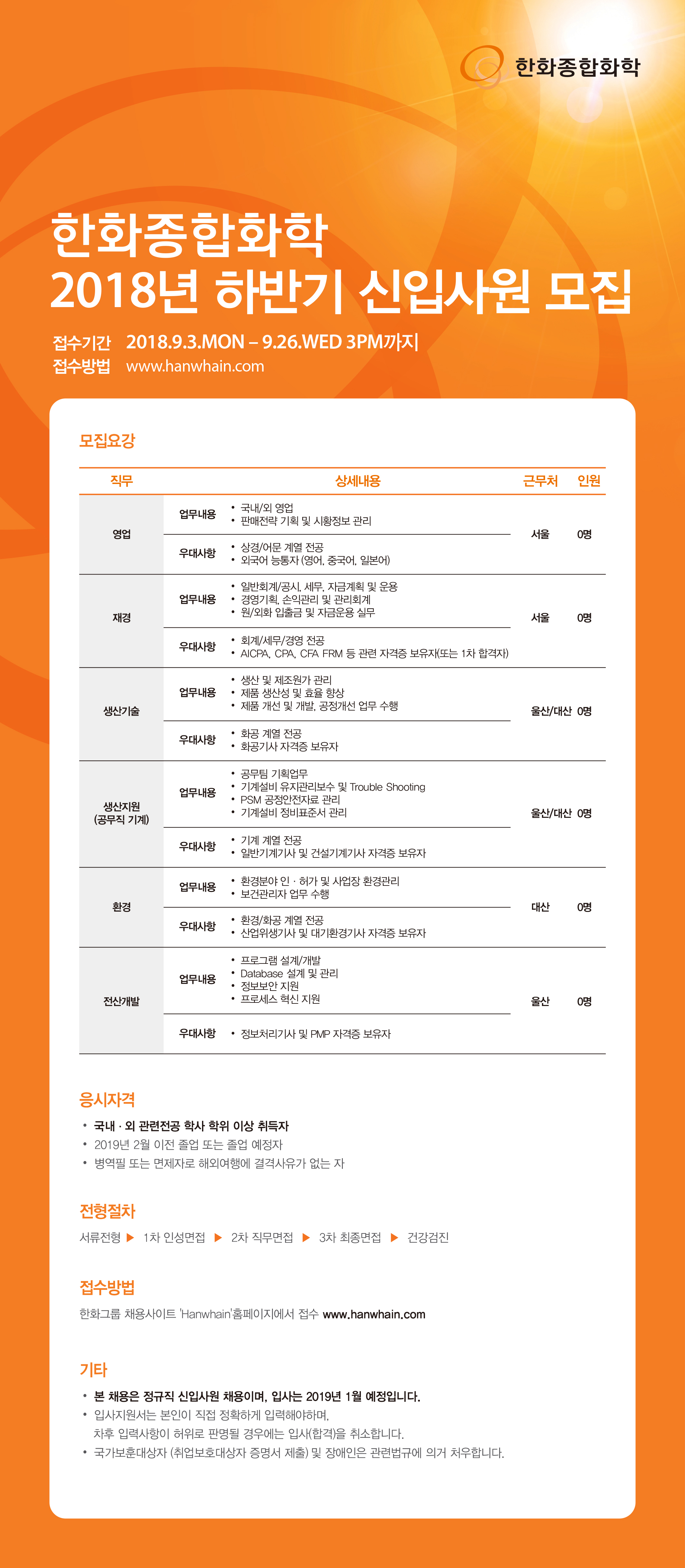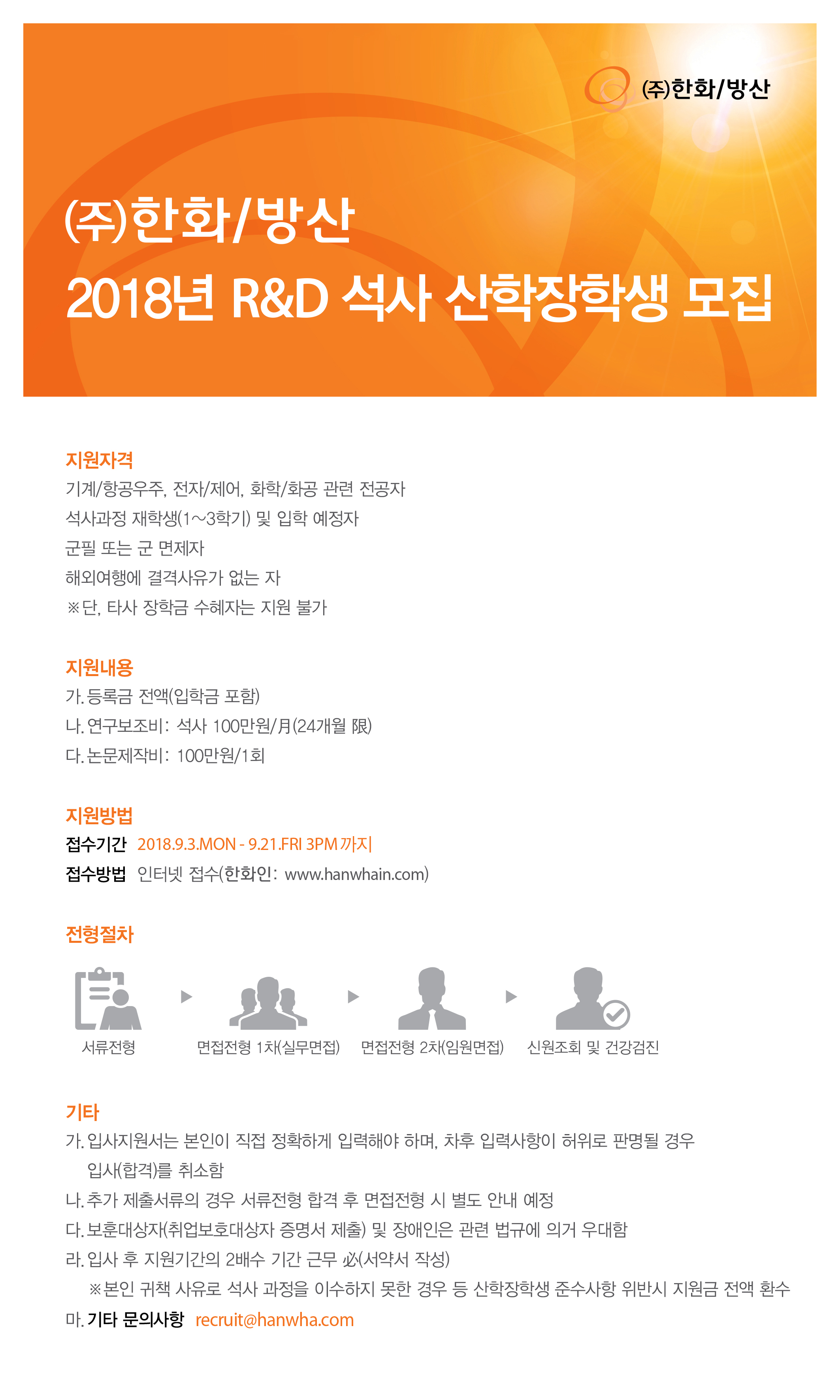 (~9/21)2018 하반기 [(주)한화/방산] R&D석사 산학장학생/동계채용전제형인턴/신입사원 채용 안내 글의 상세내용