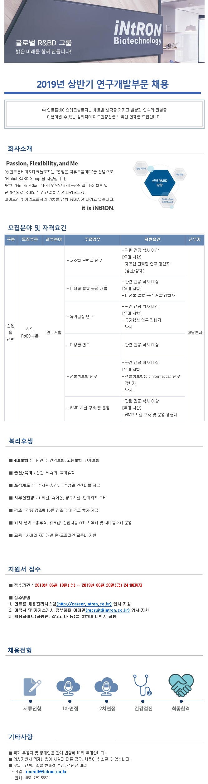 (~6/28)인트론바이오 2019년 상반기 연구개발부분 채용 안내 글의 상세내용