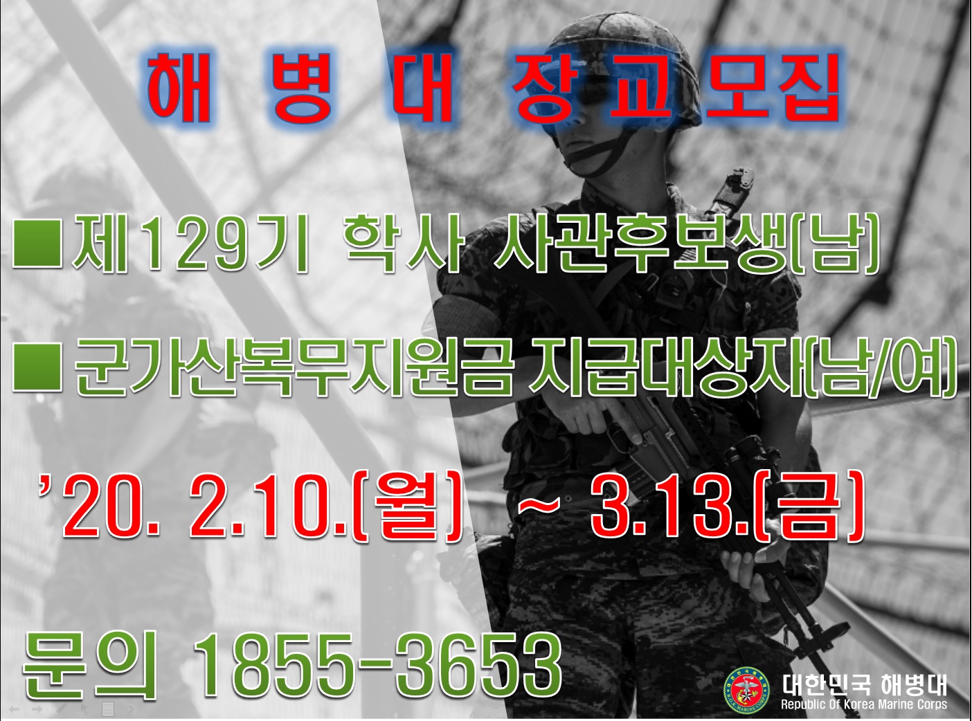 제목 (~3/17) 제129기 해병대 사관후보생(남), 군가산복무지원금대상자(장교, 남/여) 모집