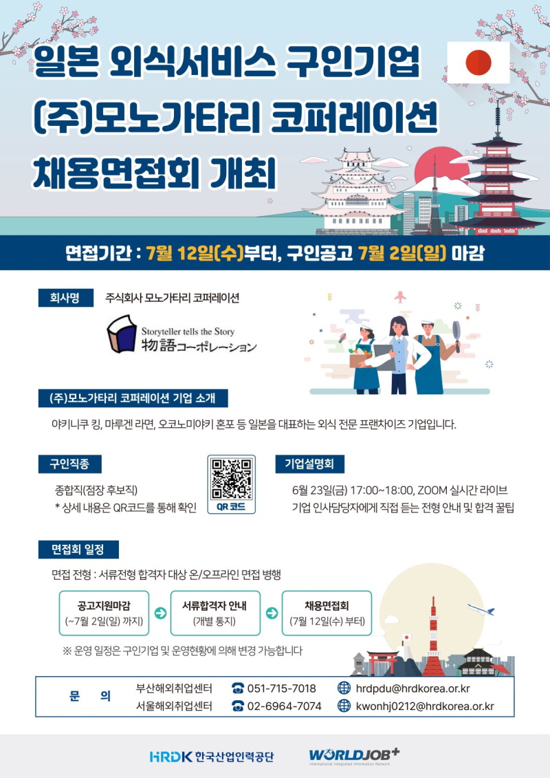 ○ 행 사 명 : 일본외식서비스 구인기업 ㈜모노가타리 코퍼레이션 채용면접회 ○ 운영일정 ‘23. 6. 23.(금) 17시~18시 : 온라인 기업설명회 ‘23. 7. 2.(일) : 공고지원 마감 ‘23. 7. 12.(수) ~ : 채용면접회 ○ 행사방법 : 온라인 운영 * 일부 오프라인 채용면접 지원 예정 ○ 참가기업 : 주식회사 모노가타리 코퍼레이션