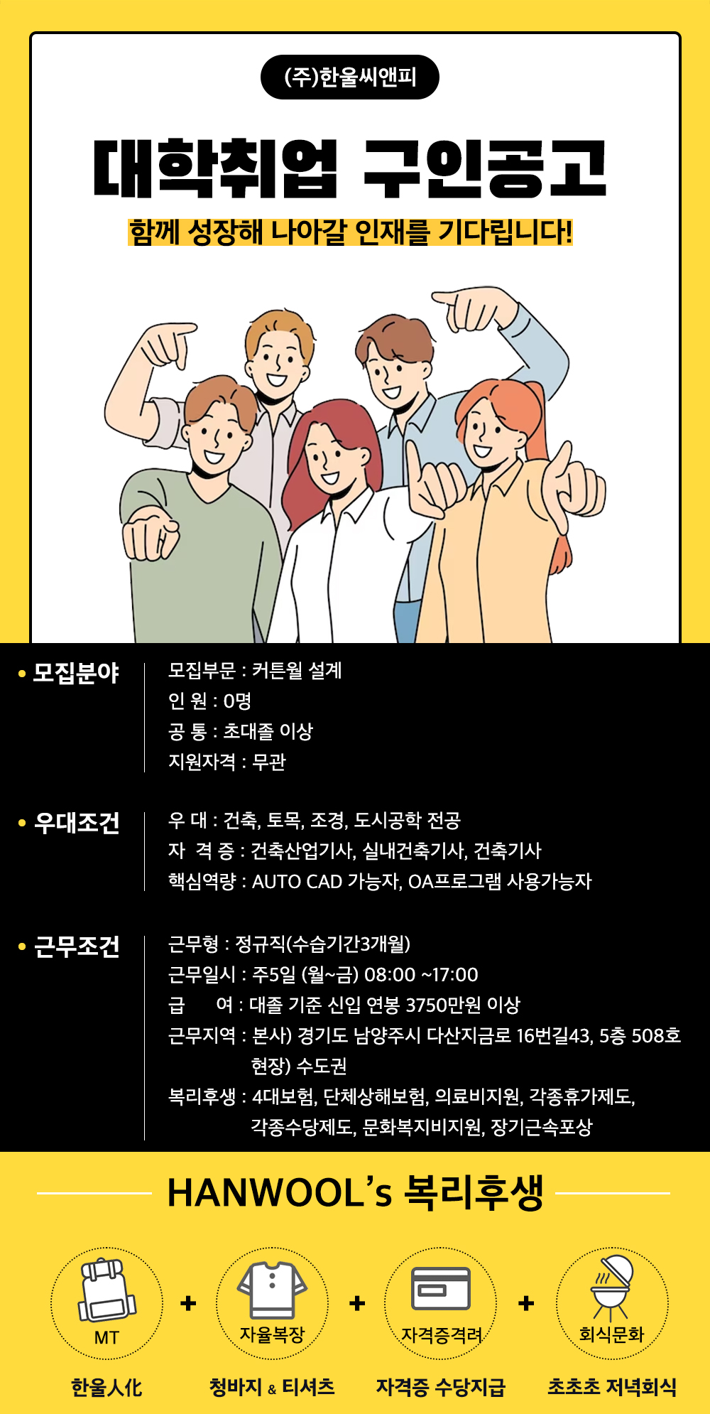 | 제목 | [(주)한울씨앤피] 커튼월 설계부분 채용 (~채용시까지) | ||||