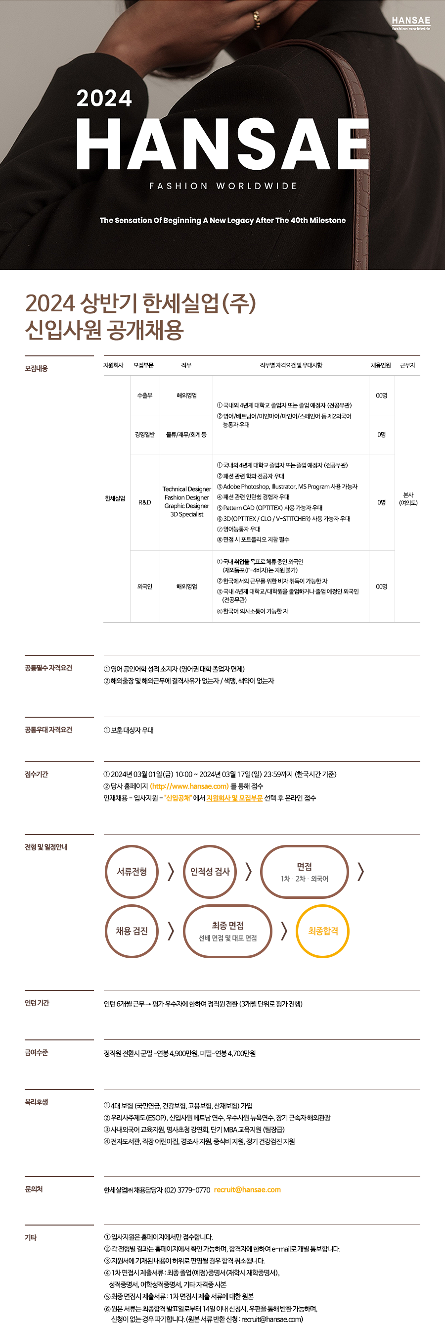 | 제목 | [한세실업(주)] 2024 상반기 신입사원 공개채용 (~3/17) | ||||