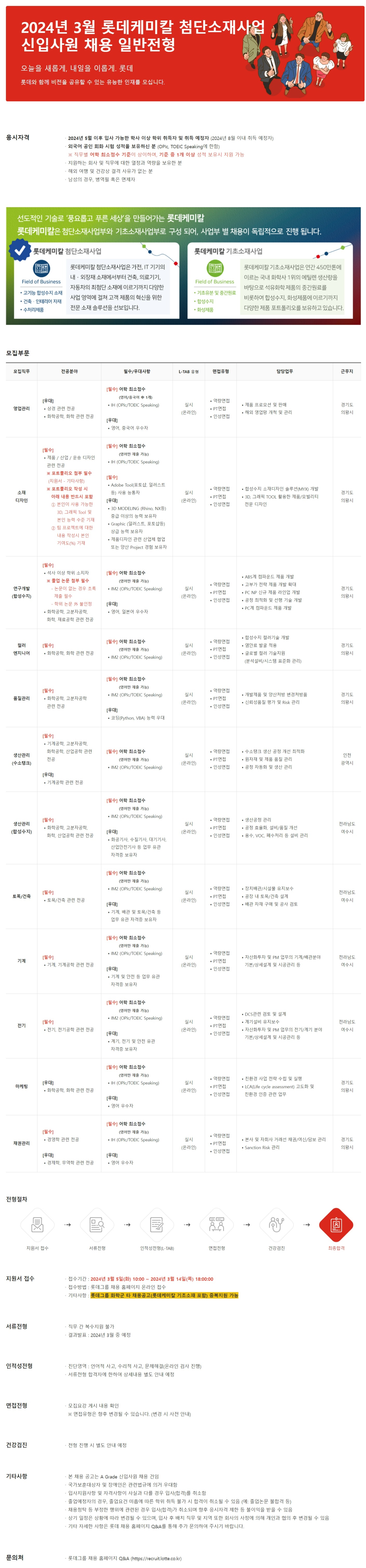 | 제목 | [롯데케미칼 첨단소재사업]2024년 상반기 신입채용 일반전형(~3/14) | ||||